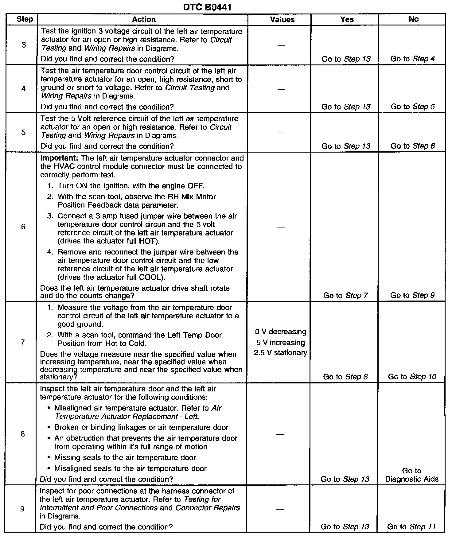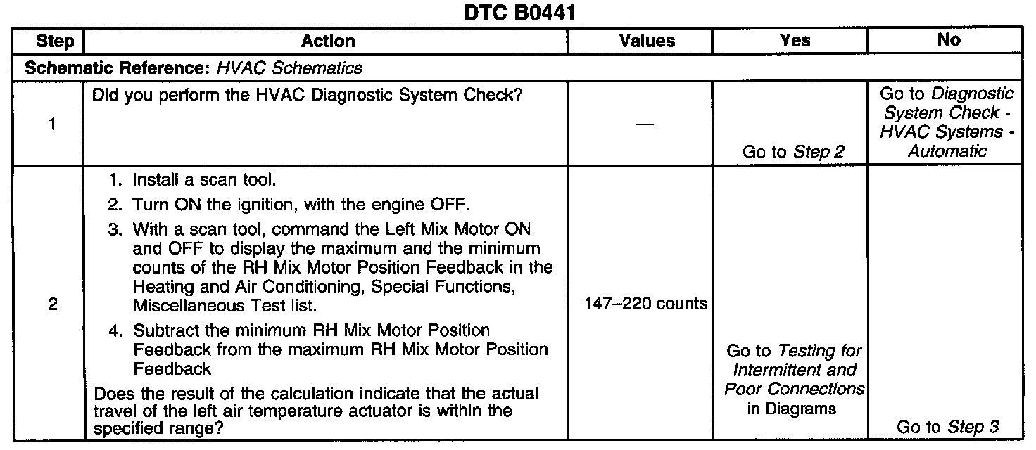 ^ The range fault code can only be detected following a check of the left air temperature actuator travel range. The left air temperature actuator travel range check can only be initiated by disrupting power to the HVAC control module (disconnecting the battery) or with the scan tool.