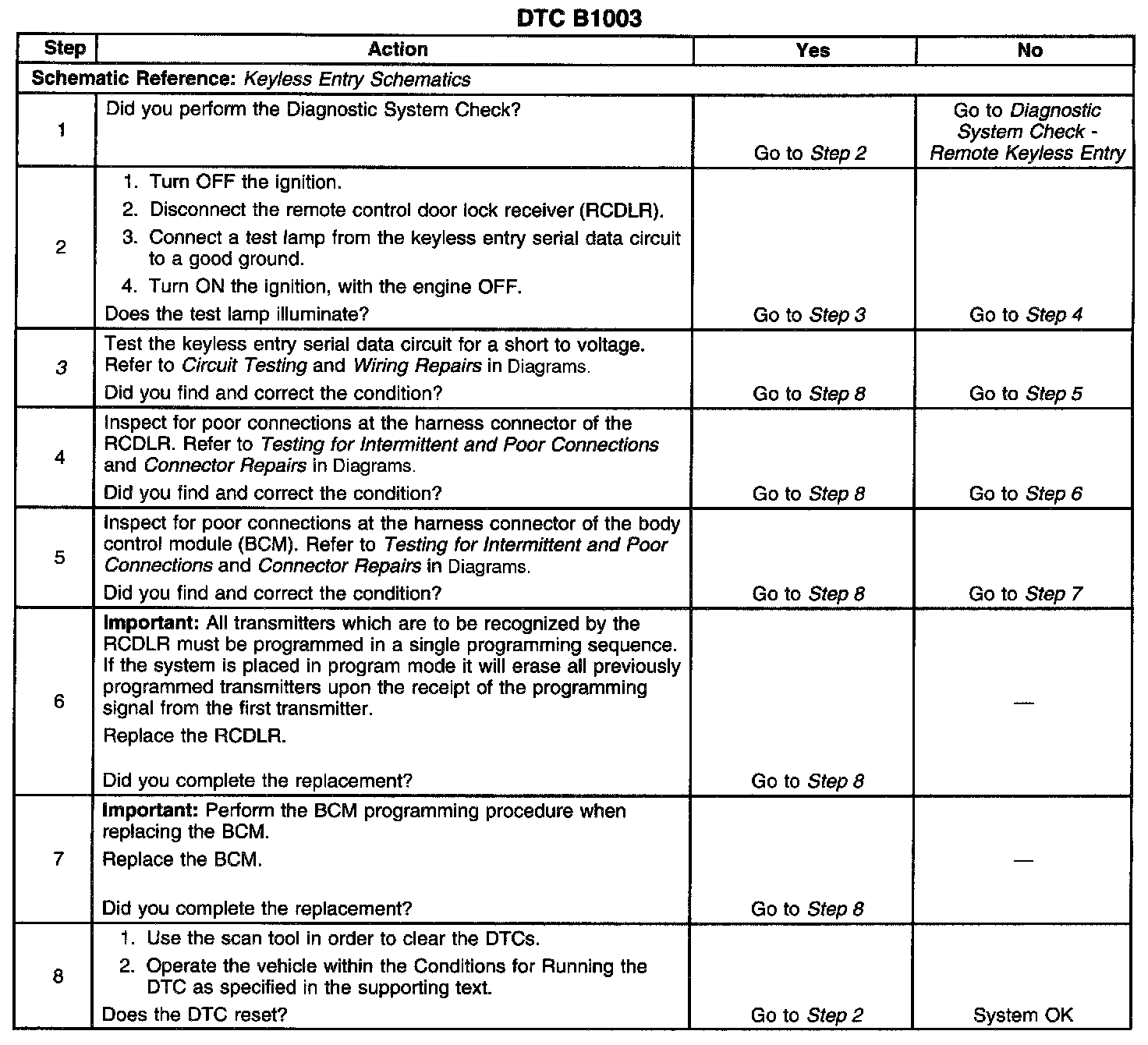 CIRCUIT DESCRIPTIONThe Remote Control Door Lock Receiver (RCDLR) communicates with the Body Control Module (BCM) through the keyless entry serial data circuit. When any button on the keyless entry transmitter is pressed, the transmitter sends a signal to the RCDLR. The RCDLR sends a lock, unlock, or panic alarm request to the BCM, depending on which button is pressed on the transmitter. The BCM receives the message and performs the appropriate function. The BCM also uses the keyless entry serial data circuit in order to communicate with the RCDLR when programming transmitters.