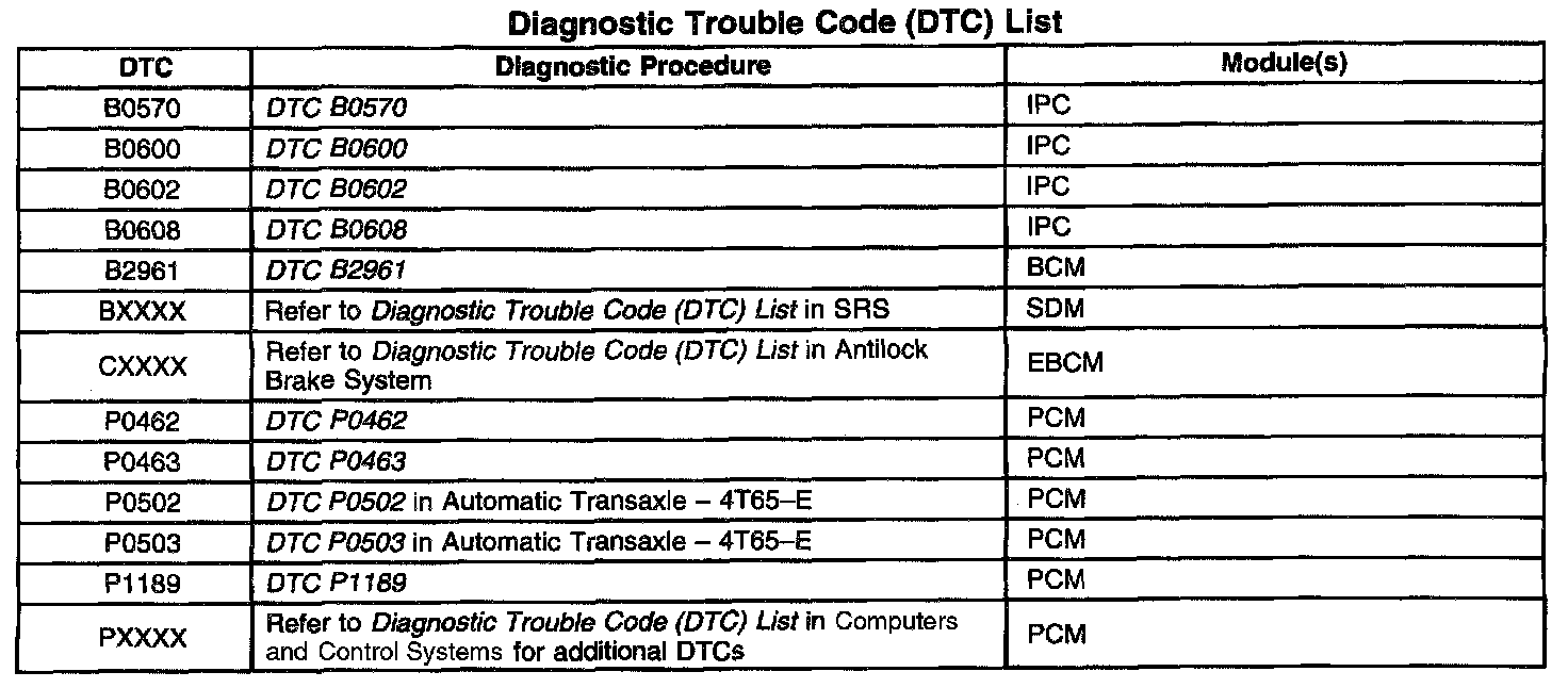 Diagnostic Trouble Code (DTC) List: