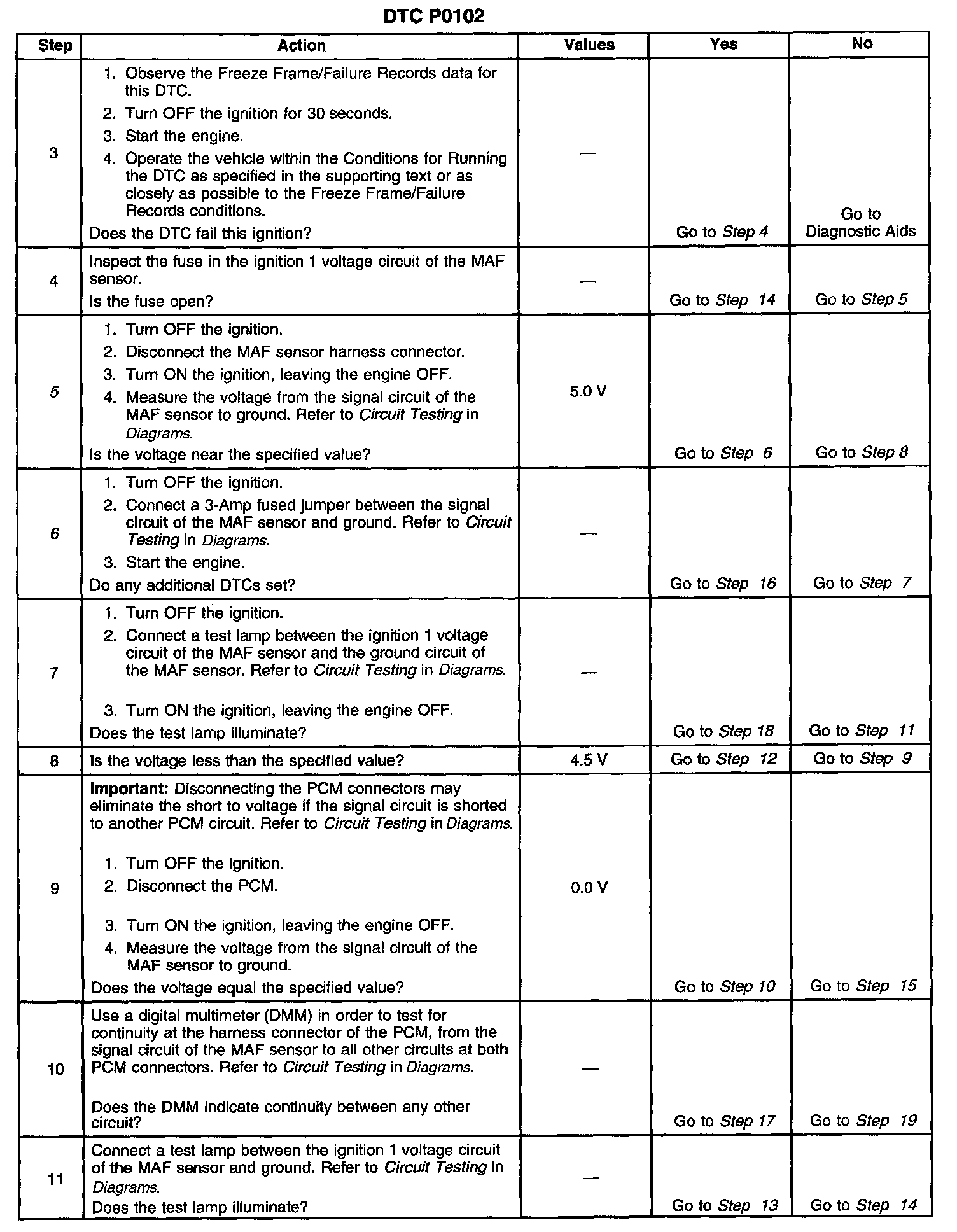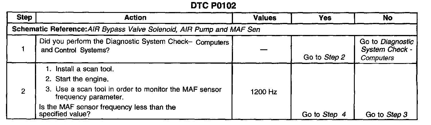 CIRCUIT DESCRIPTIONThe Mass Air Flow (MAF) sensor is an air flow meter that measures the amount of air entering the engine. The Powertrain Control Module (PCM) uses the MAF sensor frequency signal in order to provide the correct fuel delivery for a wide range of engine speeds and loads. A small quantity of air entering the engine indicates deceleration or idle. A large quantity of air entering the engine indicates an acceleration or high load situation. The MAF sensor has an ignition 1 voltage circuit, a ground circuit, and a signal circuit. The PCM applies a voltage to the sensor on the signal circuit. The sensor uses the voltage in order to produce a frequency based on inlet air flow through the sensor bore. The frequency will vary within a range of around 2000 Hz at idle to about 10,500 Hz at the maximum engine load. DTC P0102 will set if the PCM detects a frequency signal lower than the possible range of a normally operating MAF sensor.