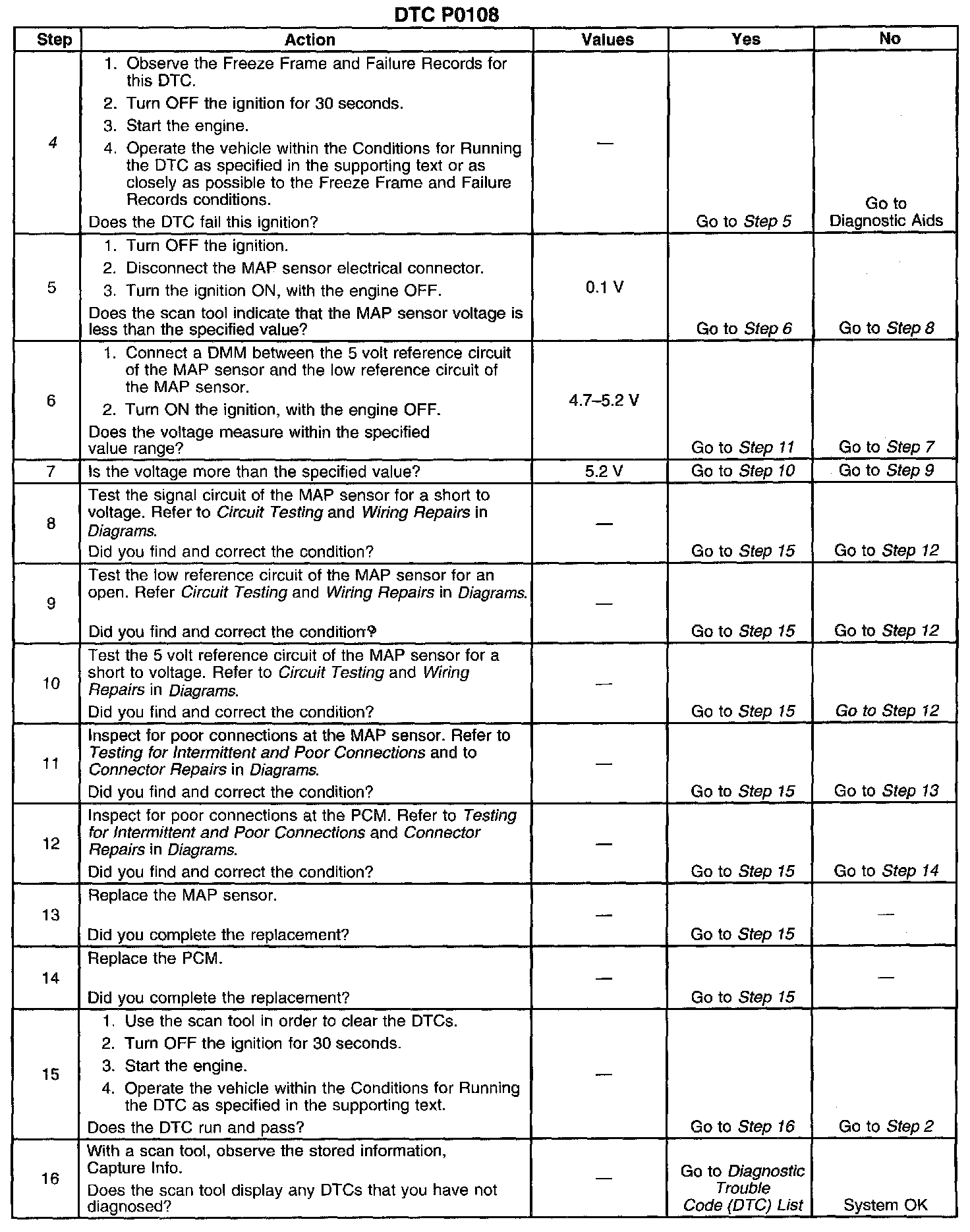 CIRCUIT DESCRIPTIONThe Manifold Absolute Pressure (MAP) sensor responds to changes in intake manifold pressure which gives an indication of the engine load. The MAP sensor has a 5 volt reference circuit, a low reference circuit, and a signal circuit. The Powertrain Control Module (PCM) supplies 5 volts to the MAP sensor on the 5 volt reference circuit and provides a ground on the low reference circuit. The MAP sensor provides a signal to the PCM on the signal circuit which is relative to the pressure changes in the manifold. With low manifold absolute pressure, such as during idle or deceleration, the PCM should detect a low MAP sensor signal voltage. With high manifold absolute pressure, such as with the ignition ON and the engine OFF or at Wide-Open Throttle (WOT), the PCM should detect a high MAP sensor signal voltage. Certain vehicles will also use the MAP sensor to calculate the Barometric Pressure (BARO) when the ignition switch is turned ON, and the engine is OFF. The BARO reading may also be updated whenever the engine is operated at Wide-Open Throttle. The PCM monitors the MAP sensor signal for voltage outside of the normal range. If the PCM detects a MAP sensor signal voltage that is excessively high, DTC P0108 will set.