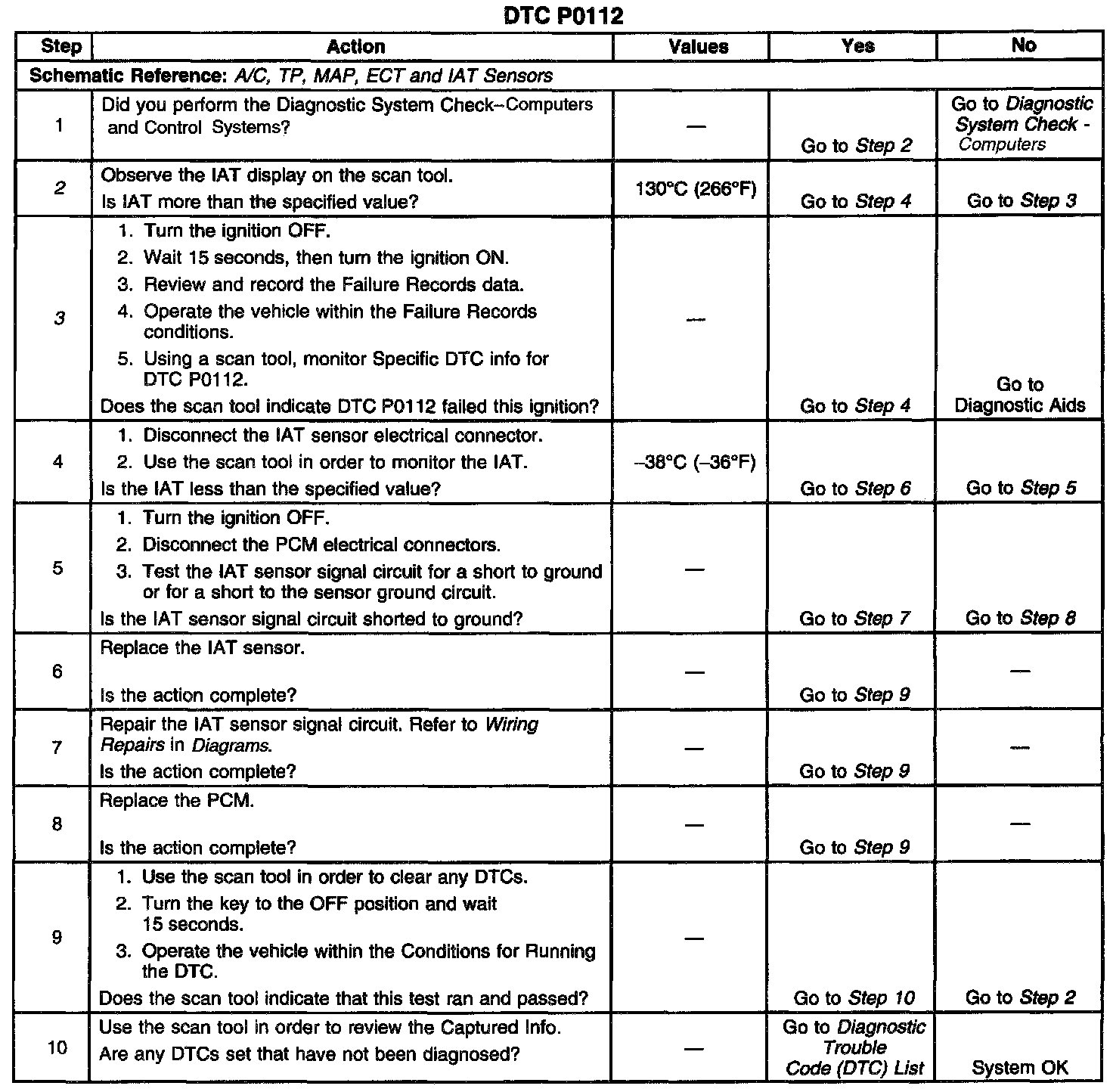 3. If DTC P0112 can be repeated only by duplicating the Failure Records conditions, refer to the Temperature vs Resistance table. The table may be used to test the IAT sensor at various temperatures to evaluate the possibility of a shifted sensor that may be shorted above or below a certain temperature. If this is the case, replace the IAT sensor. [1][2]Computers and Control Systems