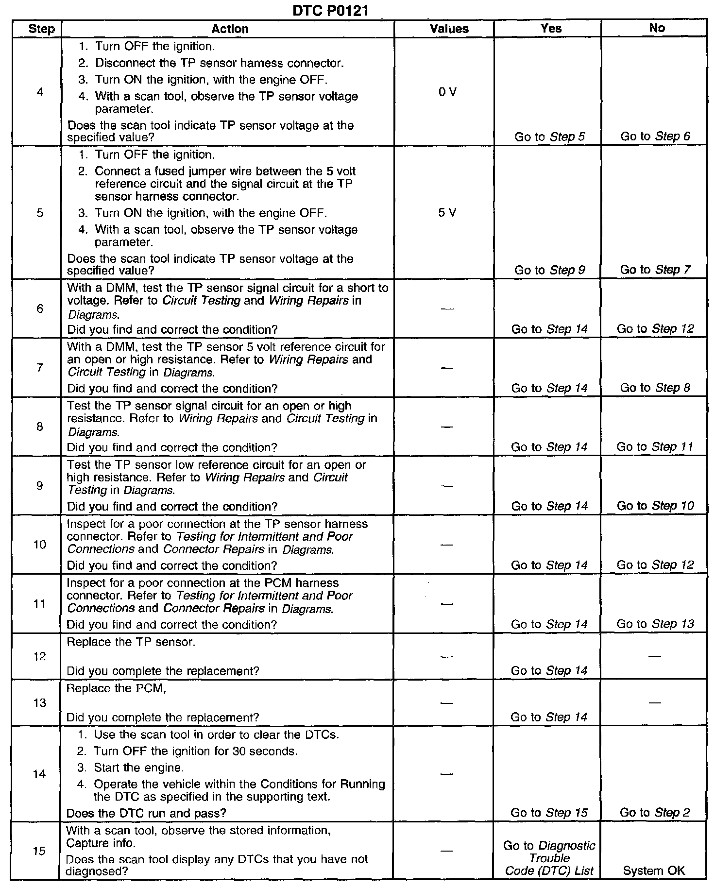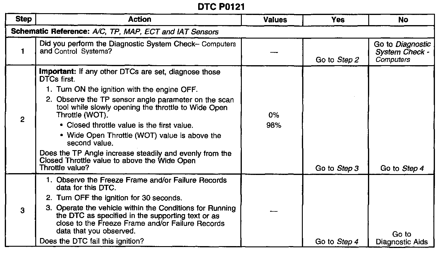 ^ If the DTC is determined to be intermittent or the TP sensor system is still suspect, refer to DTC P1121 and/or Symptoms - Computers and Control Systems in Symptoms. P1121 Symptom Related Diagnostic Procedures