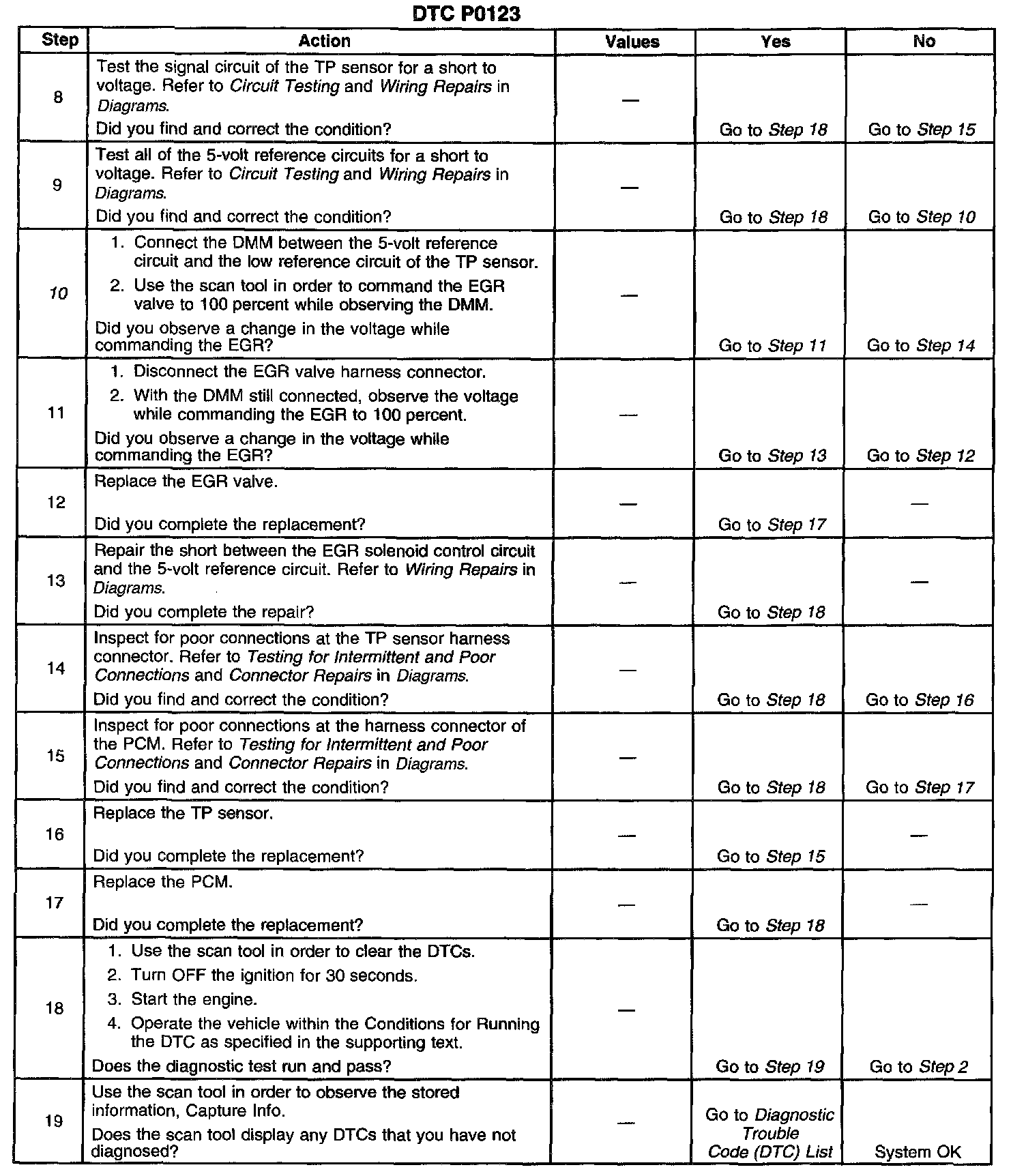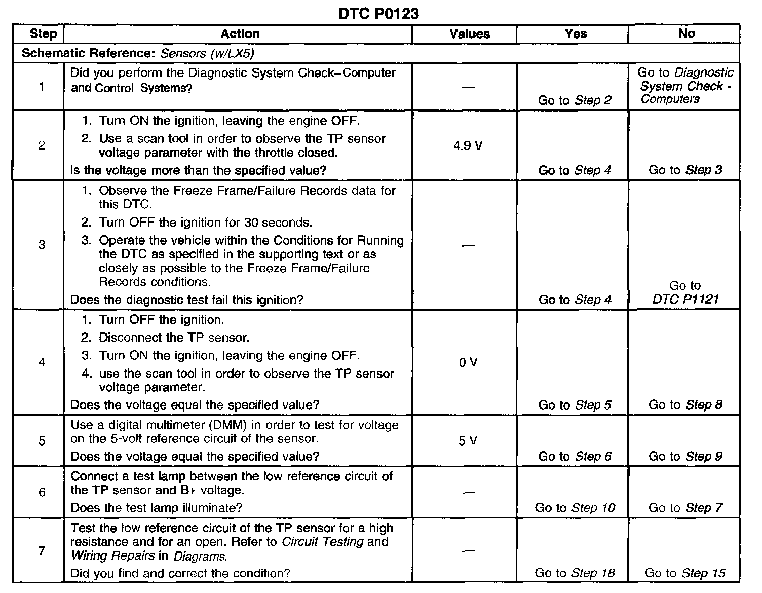 CIRCUIT DESCRIPTIONThe Throttle Position (TP) sensor is used by the PCM in order to determine the throttle plate angle for various engine management systems. The TP sensor is a potentiometer type sensor with 3 circuits: a 5-volt reference circuit, a low reference circuit, and a signal circuit. The PCM provides the TP sensor with a 5-volt reference circuit and a low reference circuit. Rotation of the TP sensor rotor from the closed throttle position to the Wide Open Throttle (WOT) position provides the PCM with a signal voltage from less than 1.0 volt to more than 4.0 volts through the TP sensor signal circuit. If the PCM detects an excessively high signal voltage, this DTC will set.