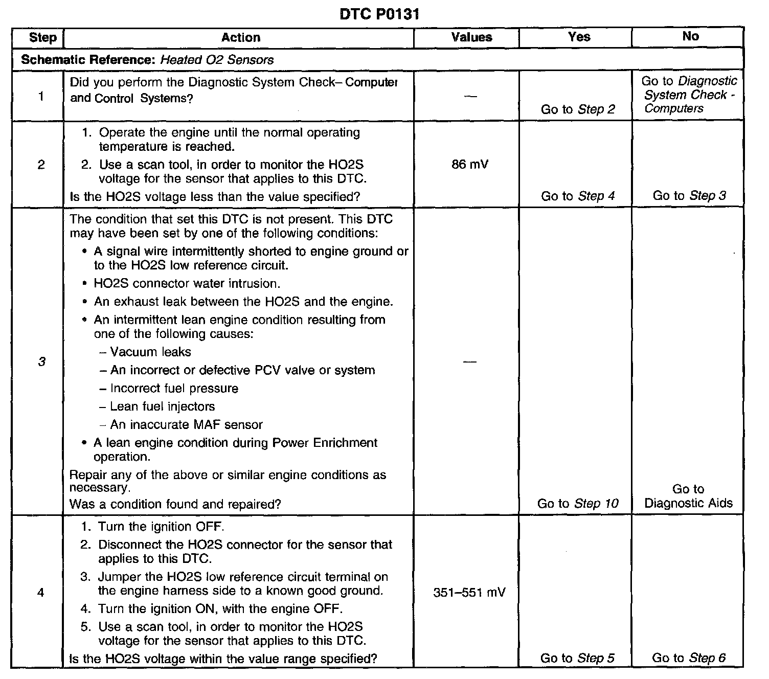 CIRCUIT DESCRIPTIONThe Powertrain Control Module (PCM) supplies a bias voltage of about 450 mV between the Heated Oxygen Sensor (HO2S) signal circuit and the HO2S low circuit. When measured with a 10 megohm digital voltmeter, this voltage may display as low as 350 mV. The oxygen sensor signal varies from about 800 mV when the exhaust is rich, to about 50 mV when the exhaust is lean. The PCM constantly monitors the HO2S signal during closed loop operation and compensates for a rich or lean condition by decreasing or increasing the injector pulse width as necessary. If the HO2S 1 voltage remains excessively low for an extended period of time, DTC P0131 will set.