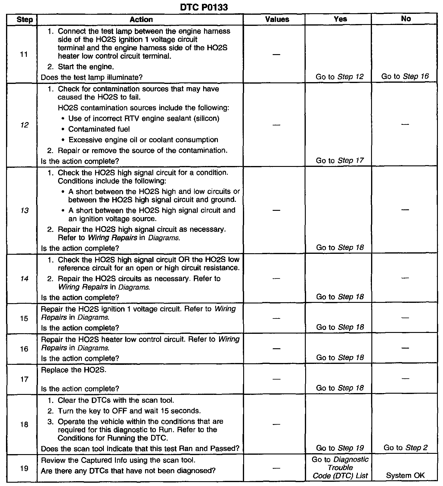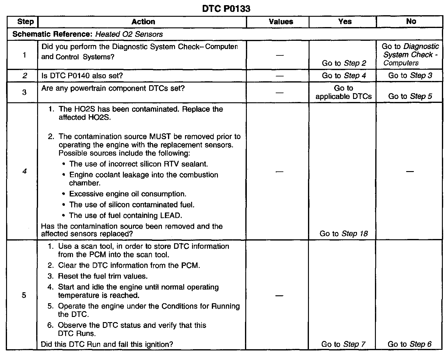 CIRCUIT DESCRIPTIONThe Powertrain Control Module (PCM) continuously monitors the Heated Oxygen Sensor (HO2S) activity for 100 seconds. During the monitoring period the PCM counts the number of rich to lean and lean to rich transitions and adds the amount of time it took to complete all transitions. With this information, an average time for each transition can be determined. If the average response lime is too slow, a DTC P0133 will set. A lean to rich transition is indicated when the HO2S voltage changes from less than 300 mV to more than 600 mV. A rich to lean transition is indicated when the HO2S voltage changes from more than 600 mV to less than 300 mV. An HO2S that responds too slowly is likely to be malfunctioning and should be replaced.