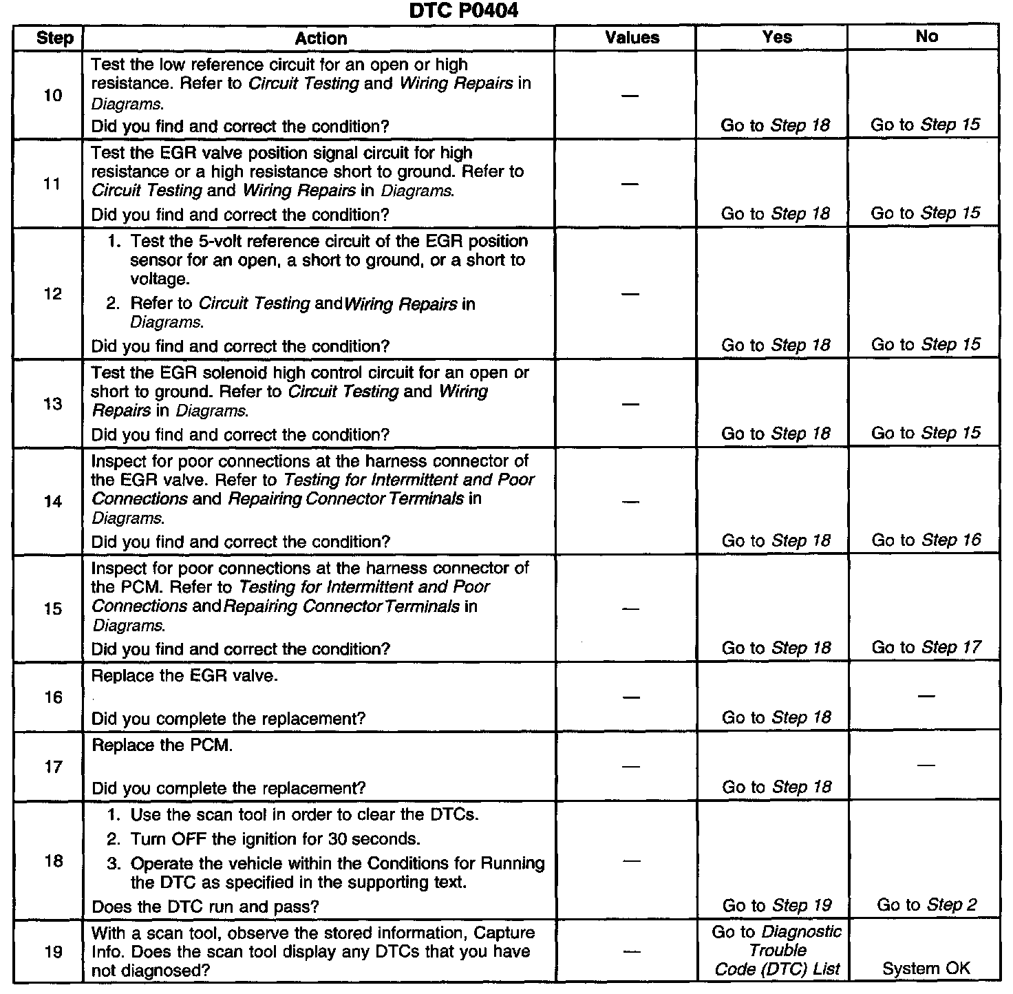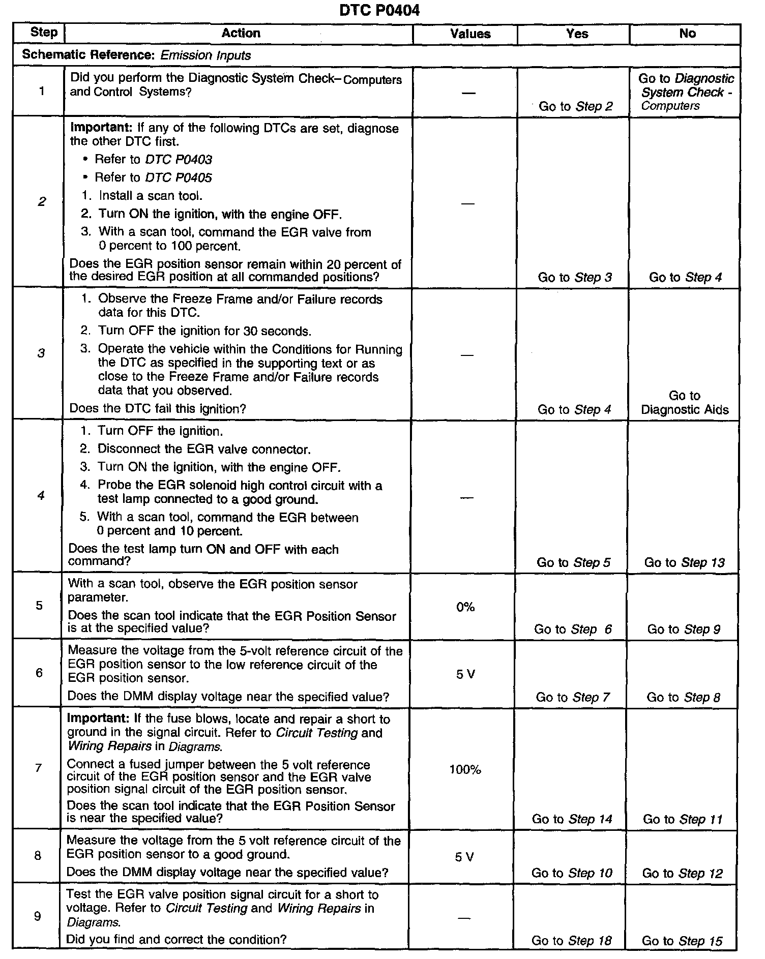 3. If DTC P0404 will only set under certain conditions, the malfunction may be intermittent. Refer to Diagnostic Aids. If an intermittent wiring problem is not present, test for a faulty connection at the PCM or the EGR valve. If the connections are OK and DTC P0404 continues to set, replace the EGR valve.