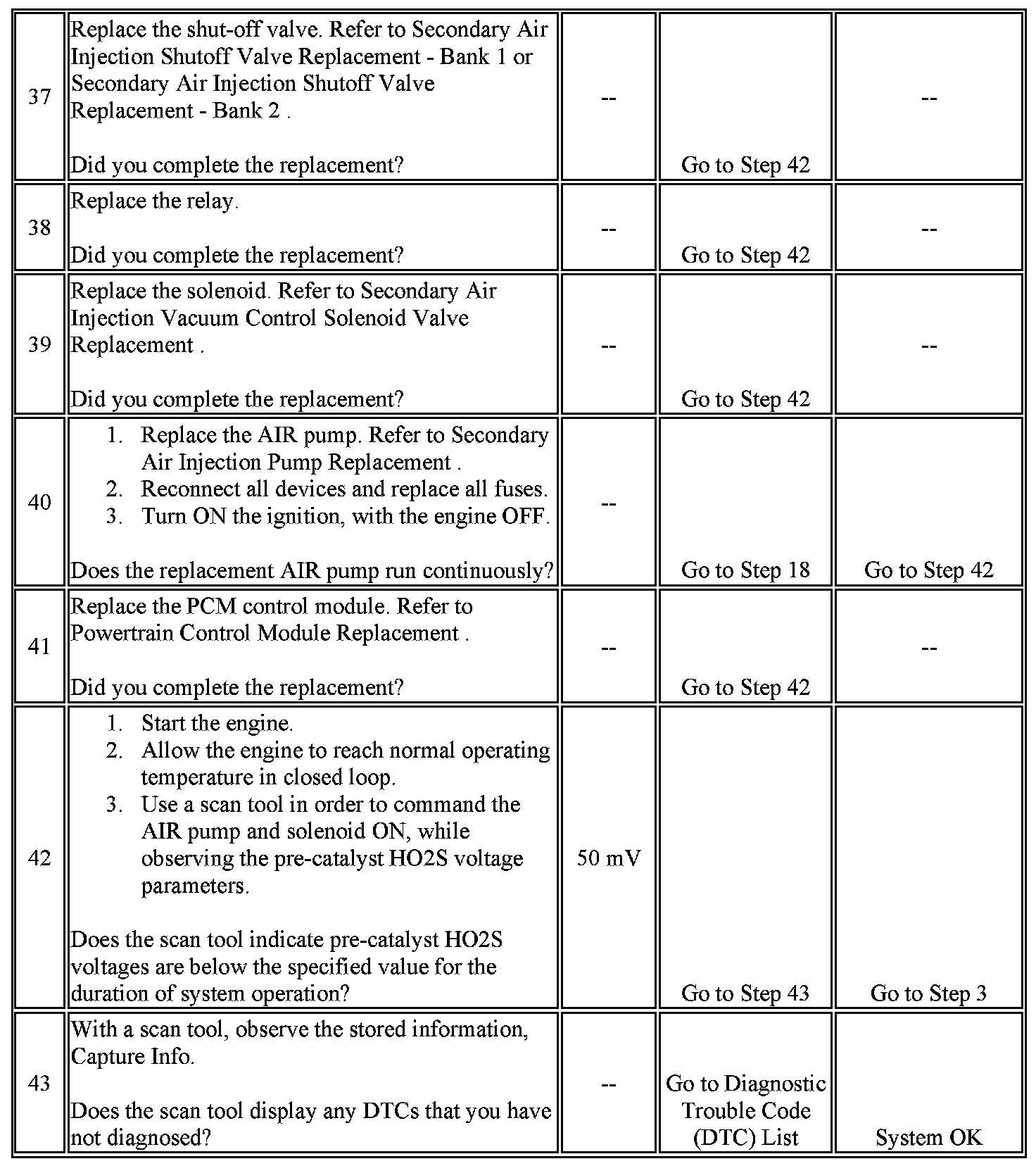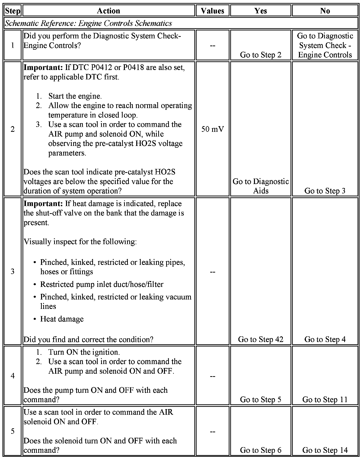 2. Other secondary air injection DTCs should be diagnosed first if set. If the HO2S voltage remains below 50 mV for approximately 5 seconds the system is operating normally.
