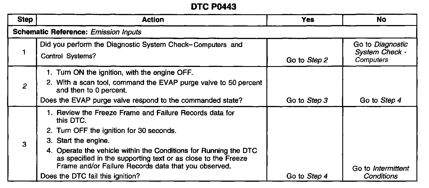 An ignition voltage is supplied directly to the EVAP purge valve. The PCM controls the EVAP purge valve by grounding the control circuit via an internal switch called a driver. The primary function of the driver is to supply the ground for the controlled component. The PCM monitors the status of the driver. If the PCM detects an incorrect voltage for the commanded state of the driver, DTC P0443 sets