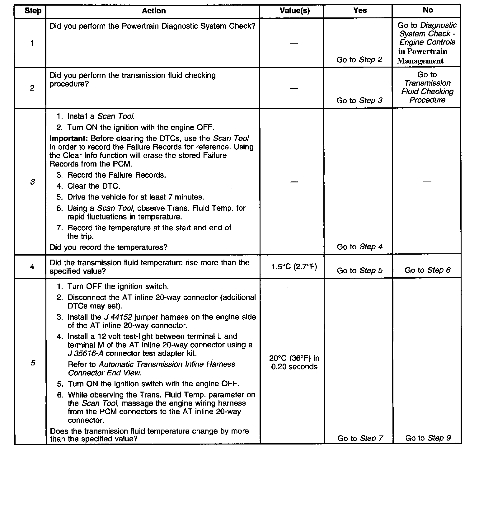 The change in transmission fluid temperature is greater than 20°C (36°F) within 0.2 seconds and this occurs at least 14 times within 7 seconds.