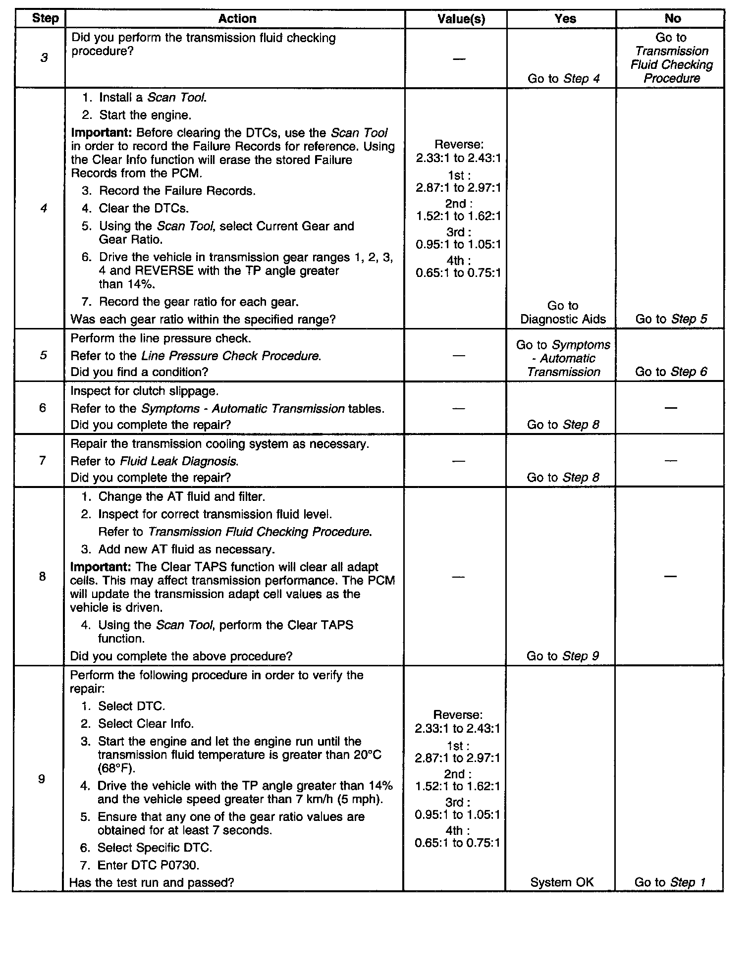 The PCM calculates the gear ratio based on data from the Automatic Transmission Input Shaft Speed (AT ISS) sensor and the Vehicle Speed Sensor (VSS). The PCM compares the known transmission gear ratio to a calculated ratio for each gear range selected. The VSS output is translated to RPM and mph by the PCM for various uses. Refer to Range Reference. If the PCM detects an incorrect gear ratio because of excessive slip within the transmission, then DTC P0730 sets. DTC P0730 is a type C DTC.