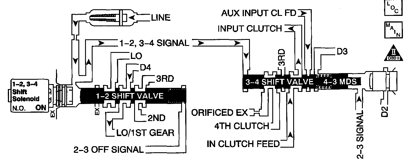 The 1-2, 3-4 shift solenoid (1-2, 3-4 SS) valve is supplied with fused ignition voltage. The ground path is controlled by the PCM. When the PCM commands the solenoid OFF, a ground path is not provided and the filtered line pressure that is fed to the solenoid is exhausted. When the PCM commands the solenoid ON, a ground path is provided and the exhaust port is blocked, stopping the exhaust of line pressure. The PCM identifies a 1-2, 3-4 SS valve condition by monitoring the commanded gear versus gear ratio. Refer to Shift Solenoid Valve State and Gear Ratio. If the PCM detects a 2nd gear ratio when 1st gear is commanded and a 3rd gear ratio when 4th gear is commanded, then DTC P0751 sets. DTC P0751 is a type B DTC.