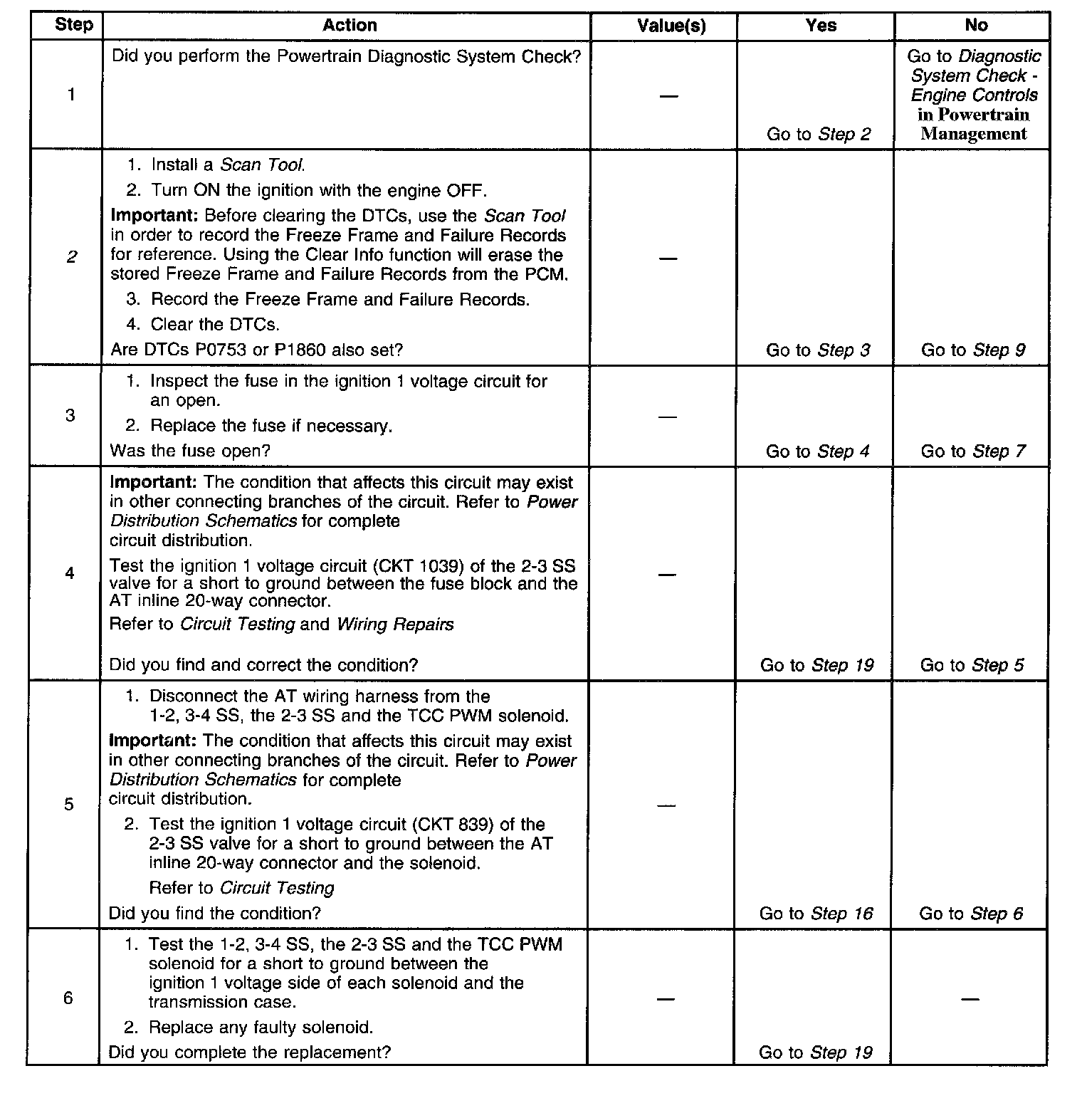 The numbers below refer to the step numbers on the diagnostic table.