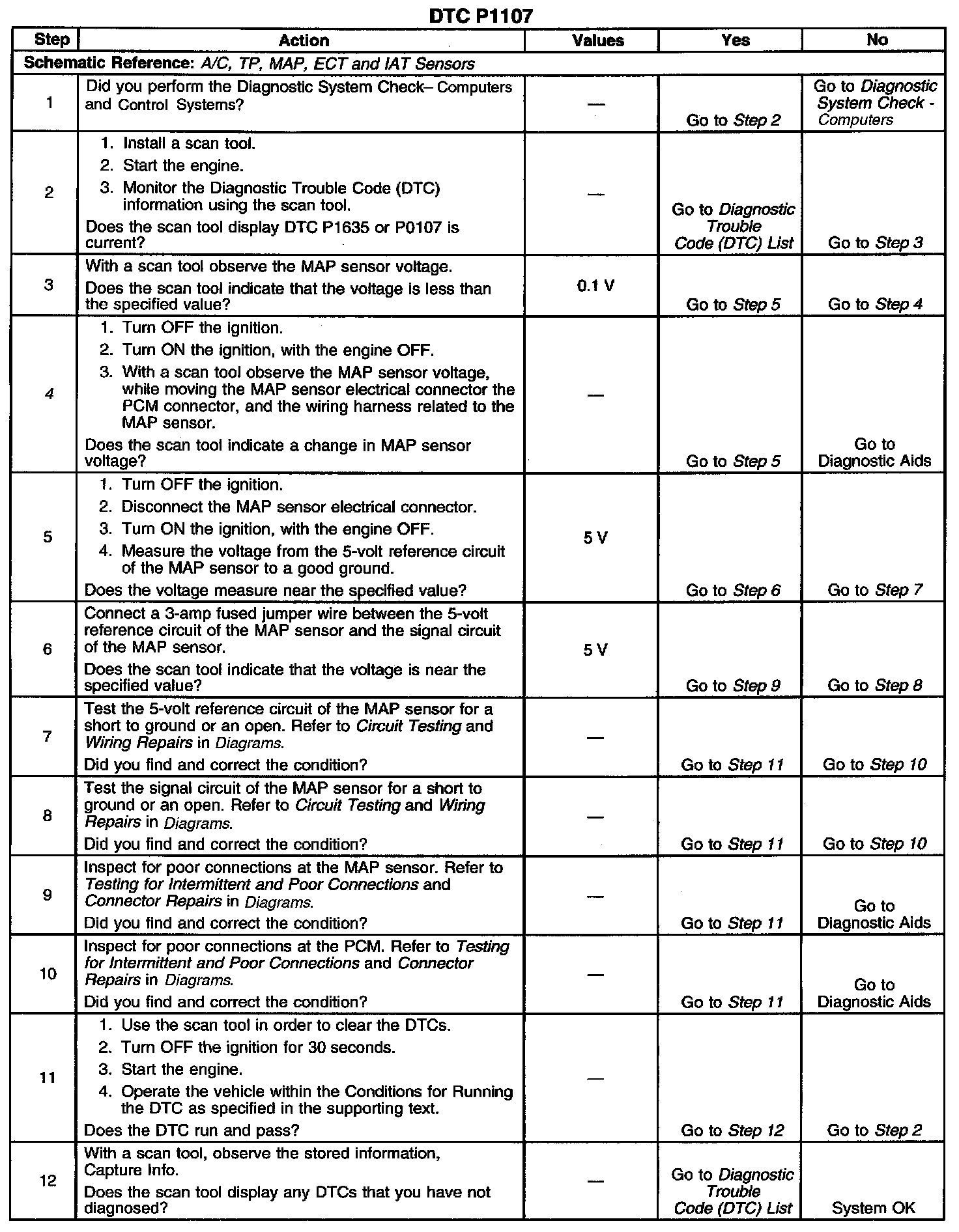 CIRCUIT DESCRIPTIONThe Manifold Absolute Pressure (MAP) sensor responds to changes in intake manifold pressure which gives an indication of the engine load. The MAP sensor has a 5-volt reference circuit, a low reference circuit, and a signal circuit. The Powertrain Control Module (PCM) supplies 5 volts to the MAP sensor on the 5-volt reference circuit and provides a ground on the low reference circuit. The MAP sensor provides a signal to the PCM on the signal circuit which is relative to the pressure changes in the manifold. With low manifold absolute pressure such as during idle or deceleration, the PCM should detect a low MAP sensor signal voltage. With high manifold absolute pressure such as ignition ON, with the engine OFF or Wide-Open Throttle (WOT), the PCM should detect a high MAP sensor signal voltage. Certain vehicle models will also use the MAP sensor in order to calculate the Barometric Pressure (BARO) when the ignition switch is turned ON, with the engine OFF. The BARO reading may also be updated whenever the engine is operated at wide-open throttle. The PCM monitors the MAP sensor signal for voltage outside of the normal range. If the PCM detects a MAP sensor signal voltage that is intermittently low DTC P1107 will set.