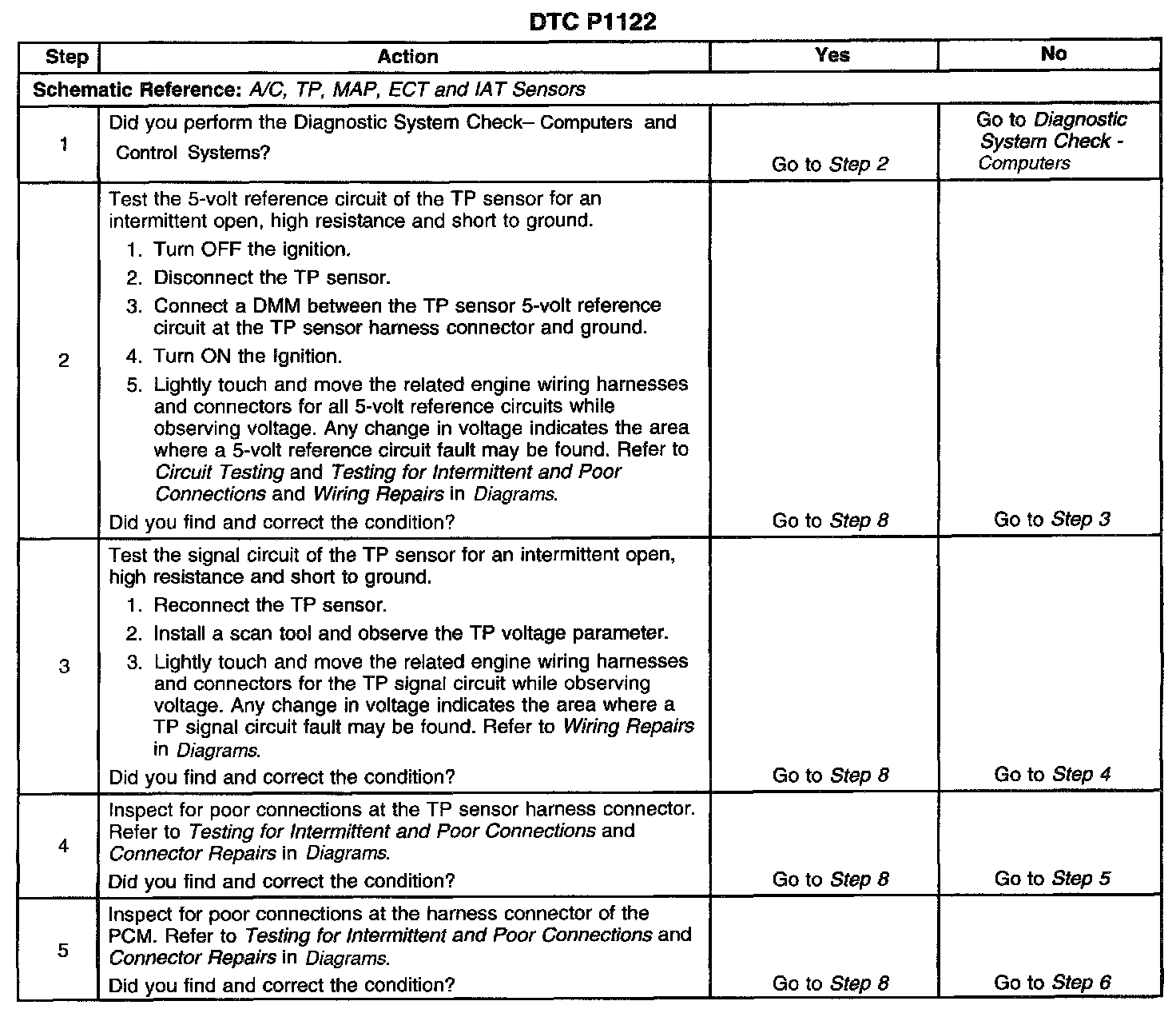CIRCUIT DESCRIPTIONThe Throttle Position (TP) sensor is used by the Powertrain Control Module (PCM) to determine the throttle plate angle for various engine management systems. The TP sensor is a potentiometer type sensor with three circuits, a 5-volt reference, a low reference, and a signal Rotation of the TP sensor rotor from the closed throttle position to the Wide Open Throttle (WOT) position provides the PCM with a signal voltage from below 1 volt to greater than 4 volts through the TP sensor signal circuit. If the PCM detects an intermittent excessively low signal voltage, This DTC will set.