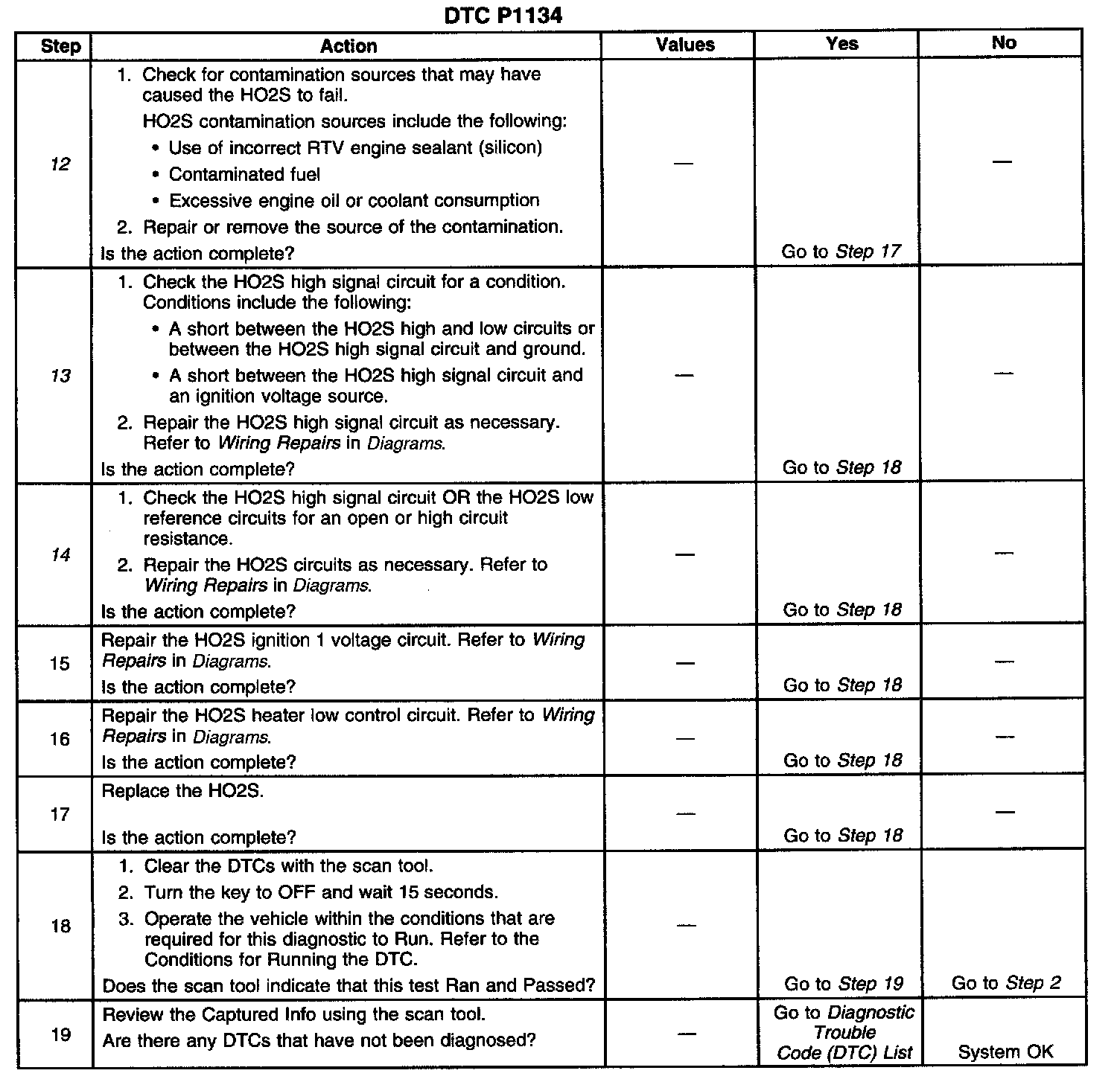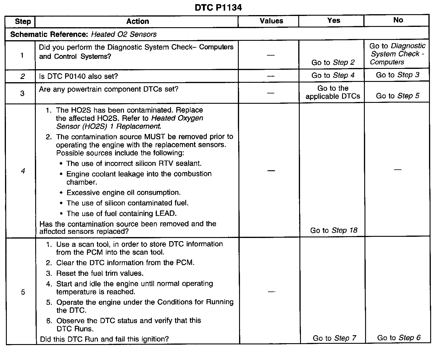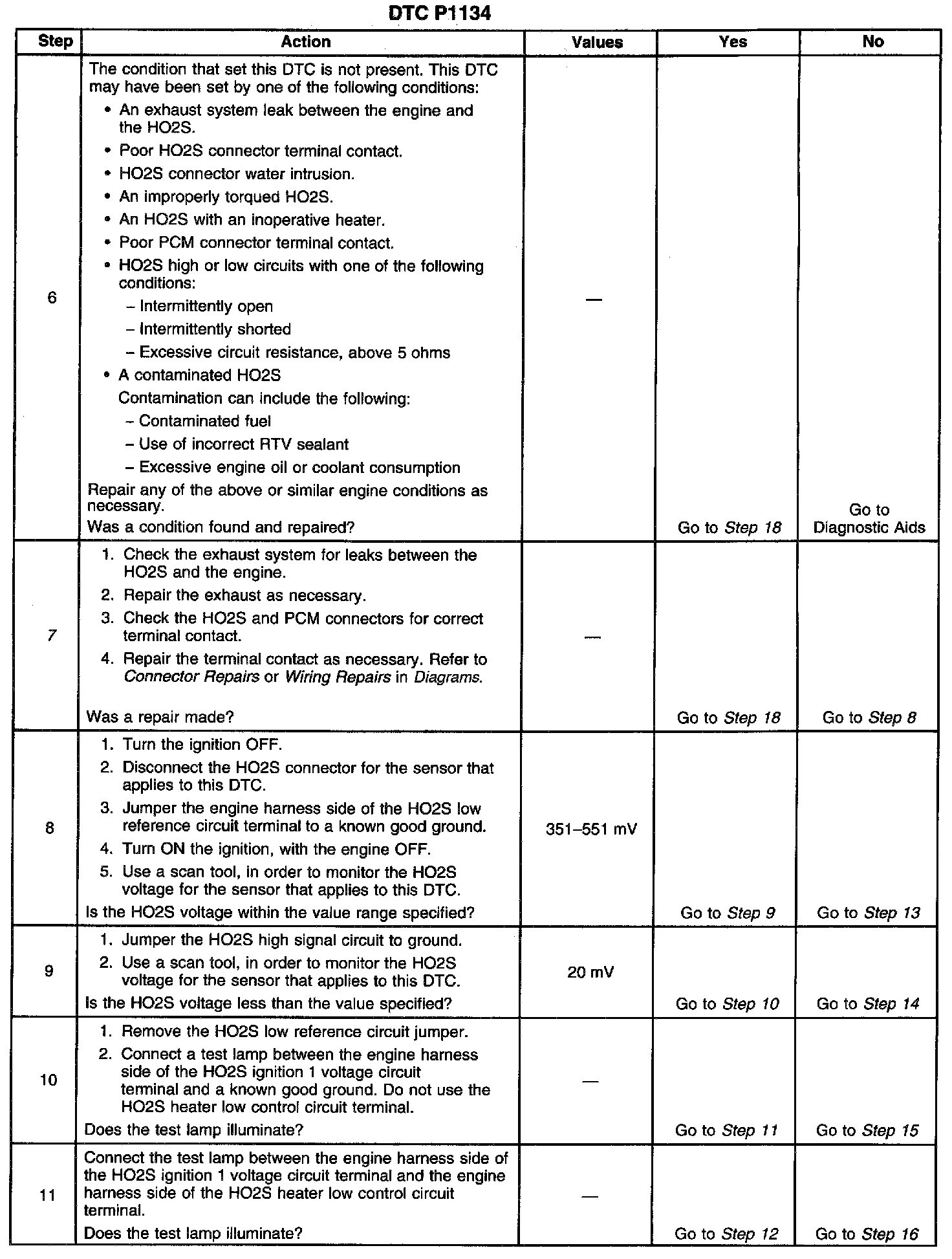 CIRCUIT DESCRIPTIONThe Powertrain Control Module (PCM) continuously monitors the heated oxygen sensor (HO2S) activity for 100 seconds. During the monitor period the PCM counts the number of times that the HO2S transitions from rich to lean and from lean to rich and adds the amount of time it took to complete all transitions. With this information, an average time for all transitions can be determined. The PCM then divides the rich to lean average by the lean to rich average to obtain a ratio. If the HO2S transition time ratio is not within range, DTC P1134 will set, indicating that the oxygen sensor is not responding as expected to changes in exhaust oxygen content.