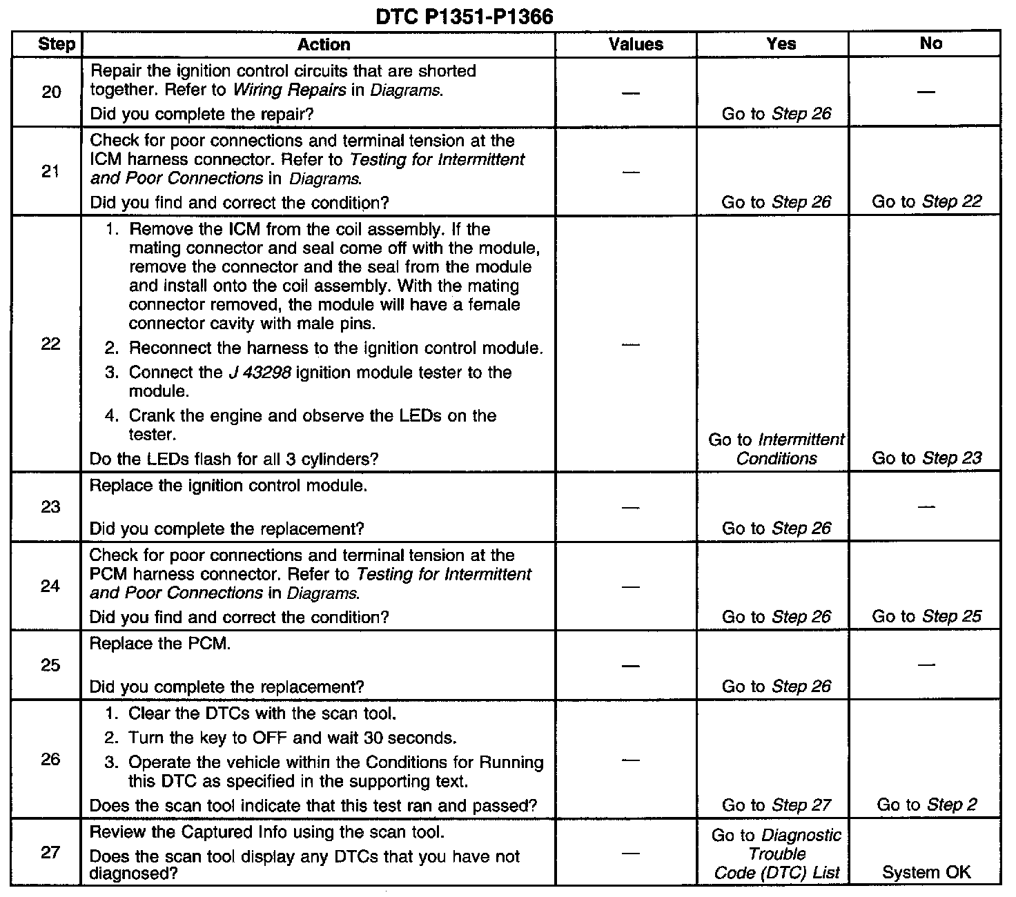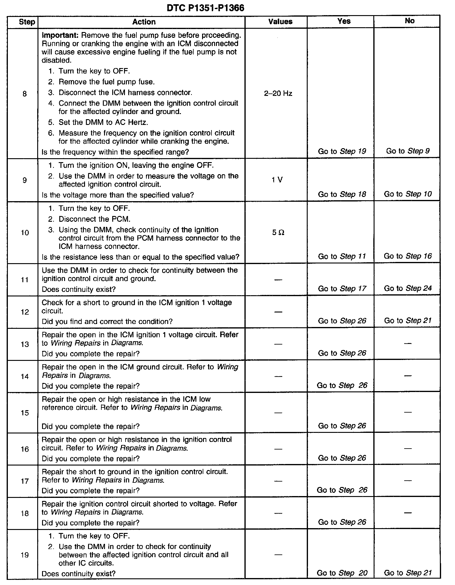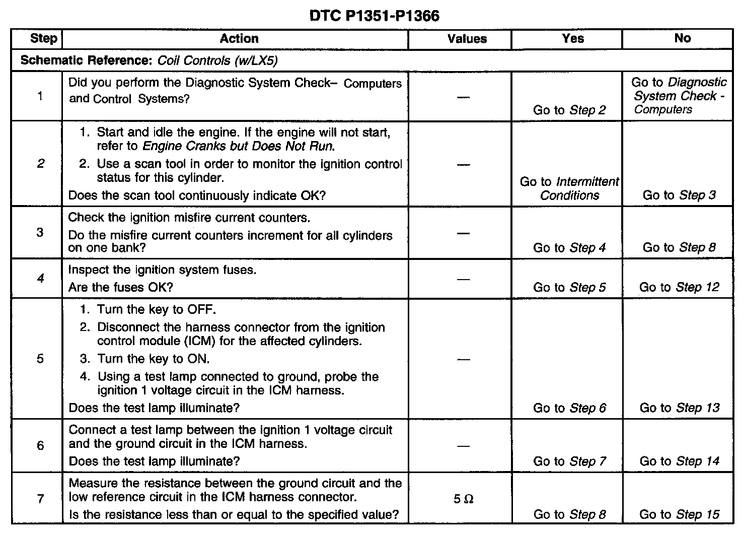 The numbers below refer to the step numbers on the diagnostic table.