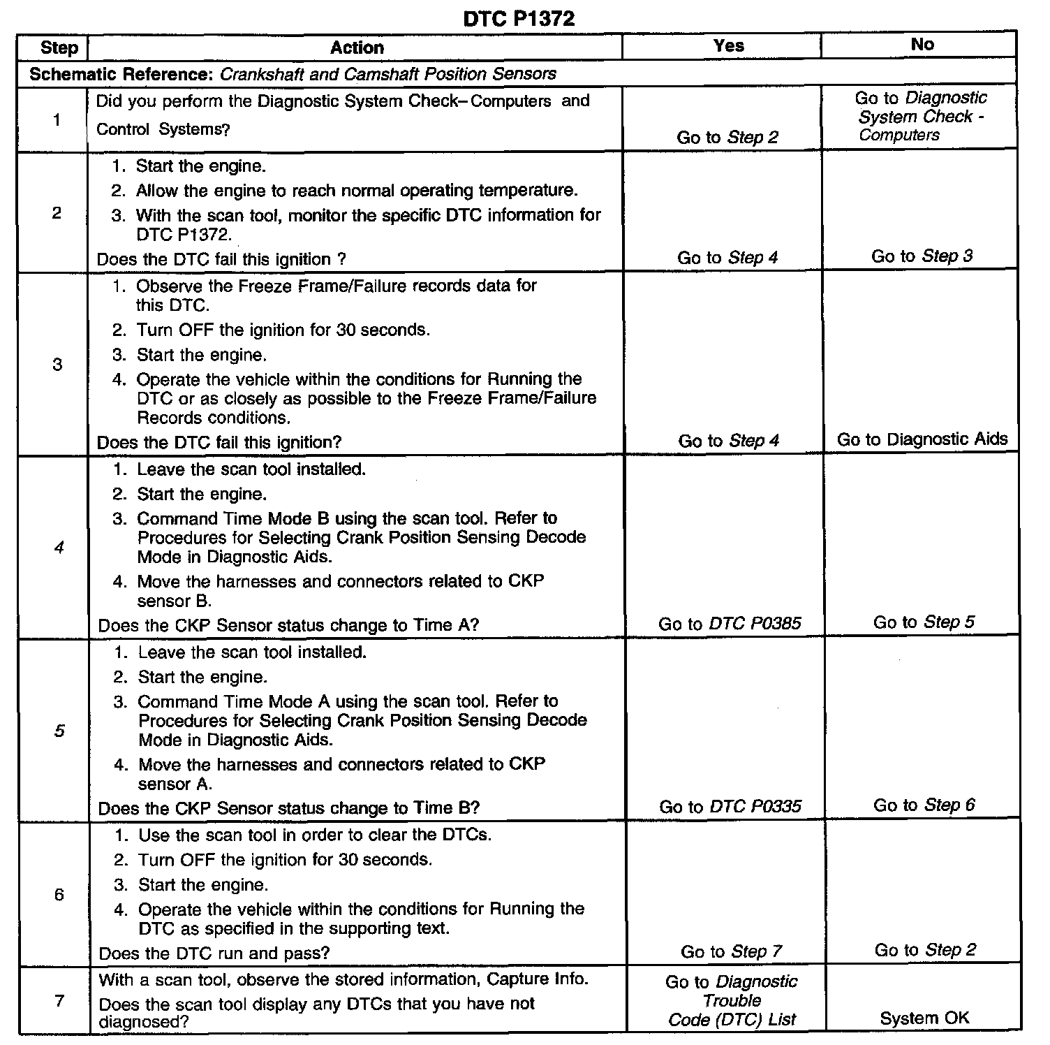 When either CKP signal is lost, the PCM will compare the MEDRES signal to the Camshaft Position (CMP) sensor signal. If the PCM detects a valid CMP signal, and the MEDRES to CMP signal correlation is correct, the PCM determines that CKP sensor A is at fault. However, if the MEDRES to CMP correlation is incorrect, the PCM determines that CKP sensor B is at fault. If, while in the angle based mode, the PCM detects an intermittent loss of either CkP signal, DTC P1372 will set.