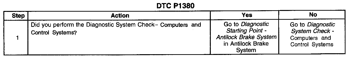 If DTC P1380 is set, the Antilock Brake System (ABS)/ Traction Control System (TCS) has detected a malfunction which is preventing the EBCM or EBTCM from transmitting correct rough road data to the PCM. Refer to Diagnostic Starting Point - Antilock Brake System in Antilock Brake System.