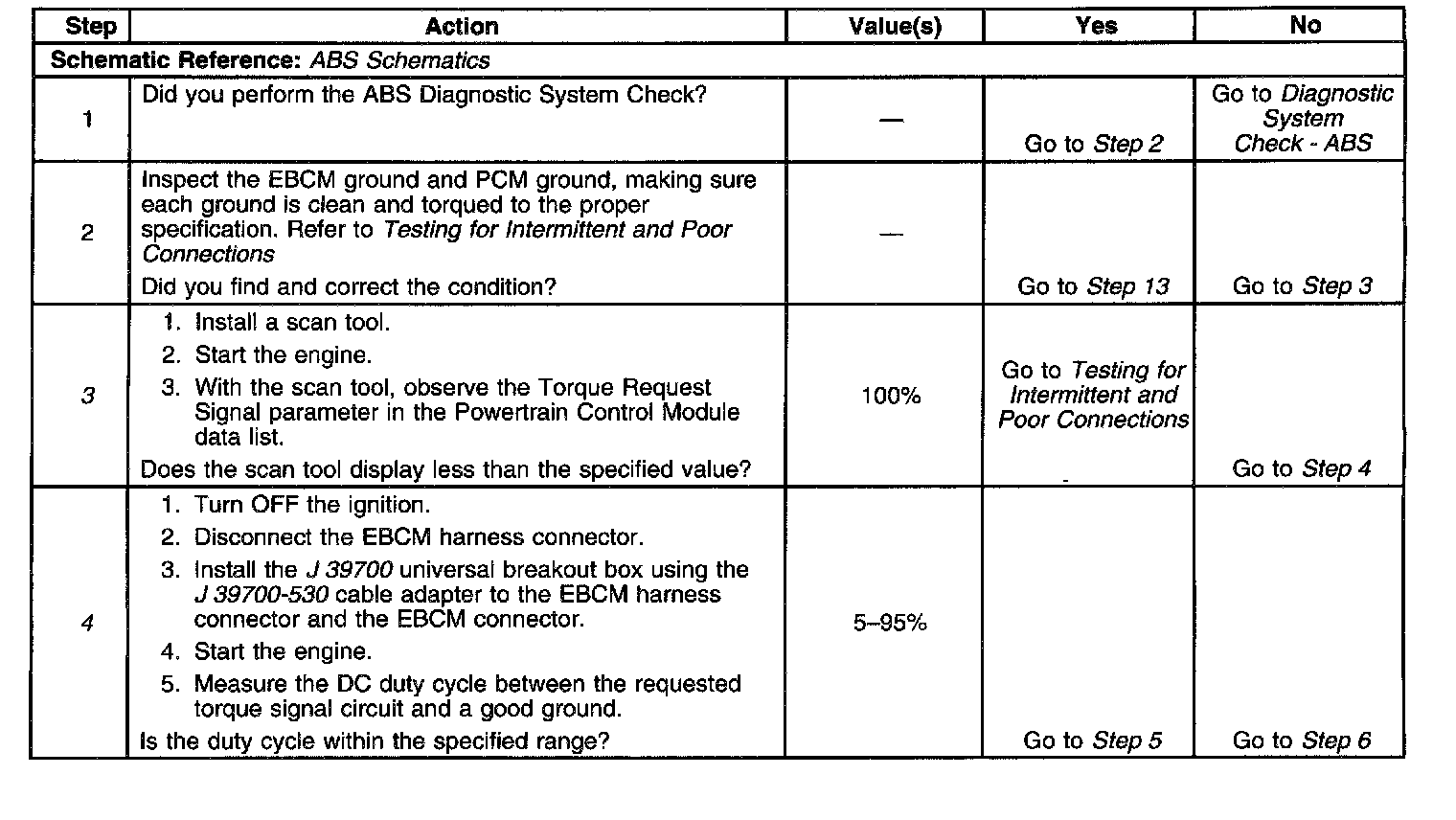 The EBCM and the PCM simultaneously control the traction control. The EBCM sends a Requested Torque message via a pulse width modulated (PWM) signal to the PCM. The duty cycle of the signal is used to determine how much engine torque the EBCM is requesting the PCM to deliver. Normal values are between 10 and 90 percent duty cycle. The signal should be at 90 percent when traction control is not active and at lower values during traction control activations. The PCM supplies the pull up voltage that the EBCM switches to ground to create the signal.