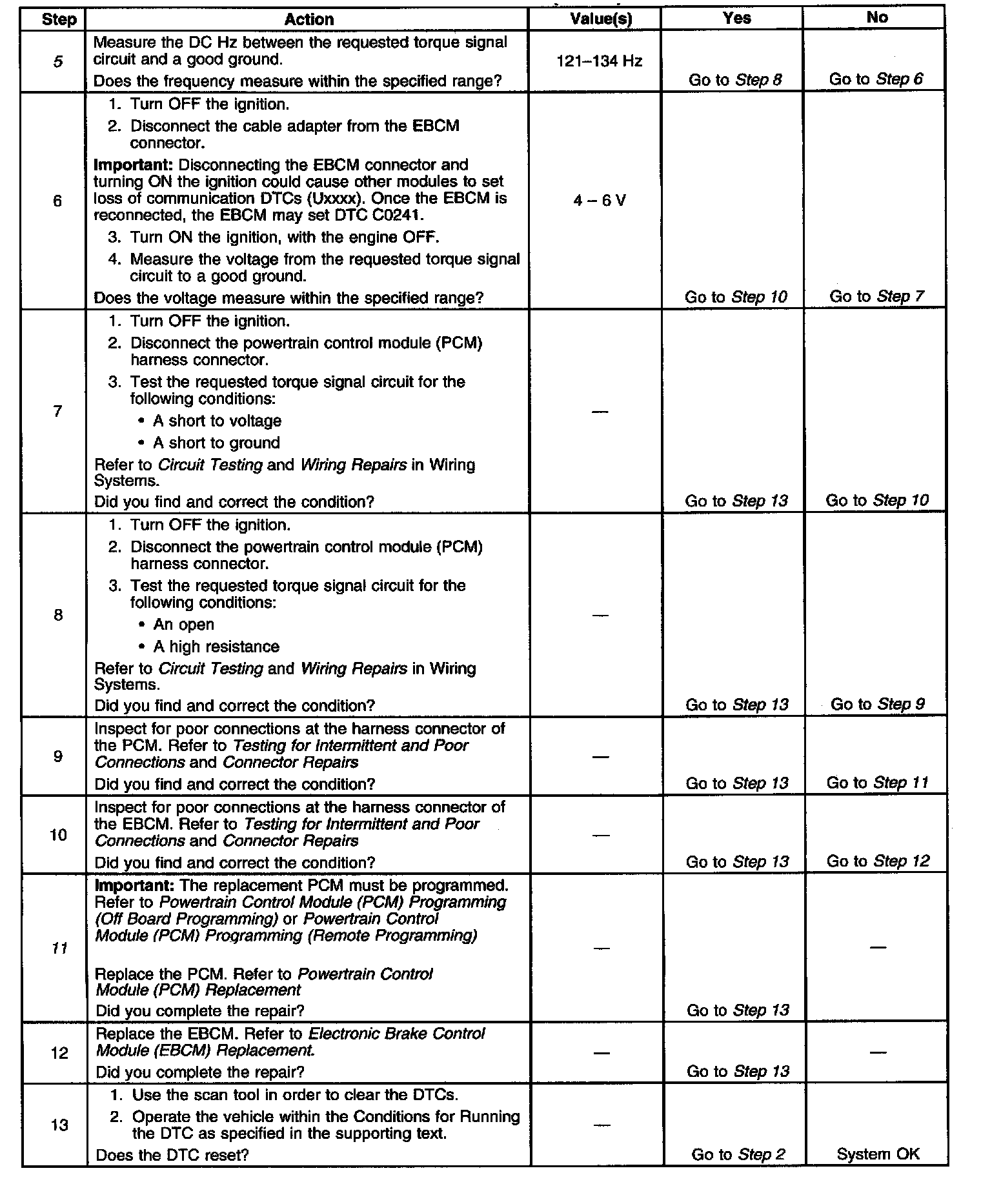 The PCM diagnoses the requested torque PWM signal circuit and sends a class 2 serial data message to the EBCM indicating a fault is present. A fault exists in the circuit if the PCM detects one of the following conditions: