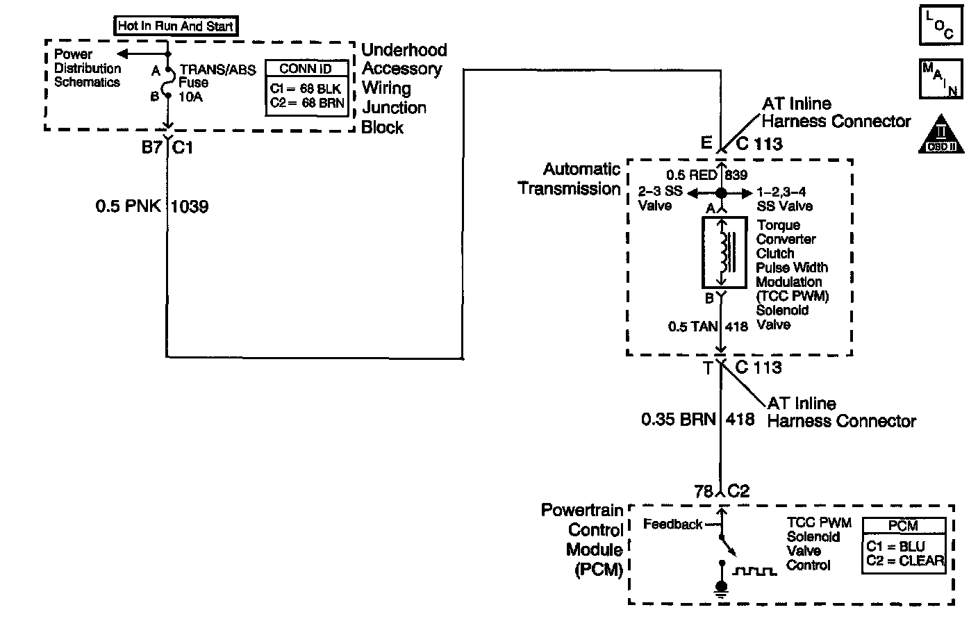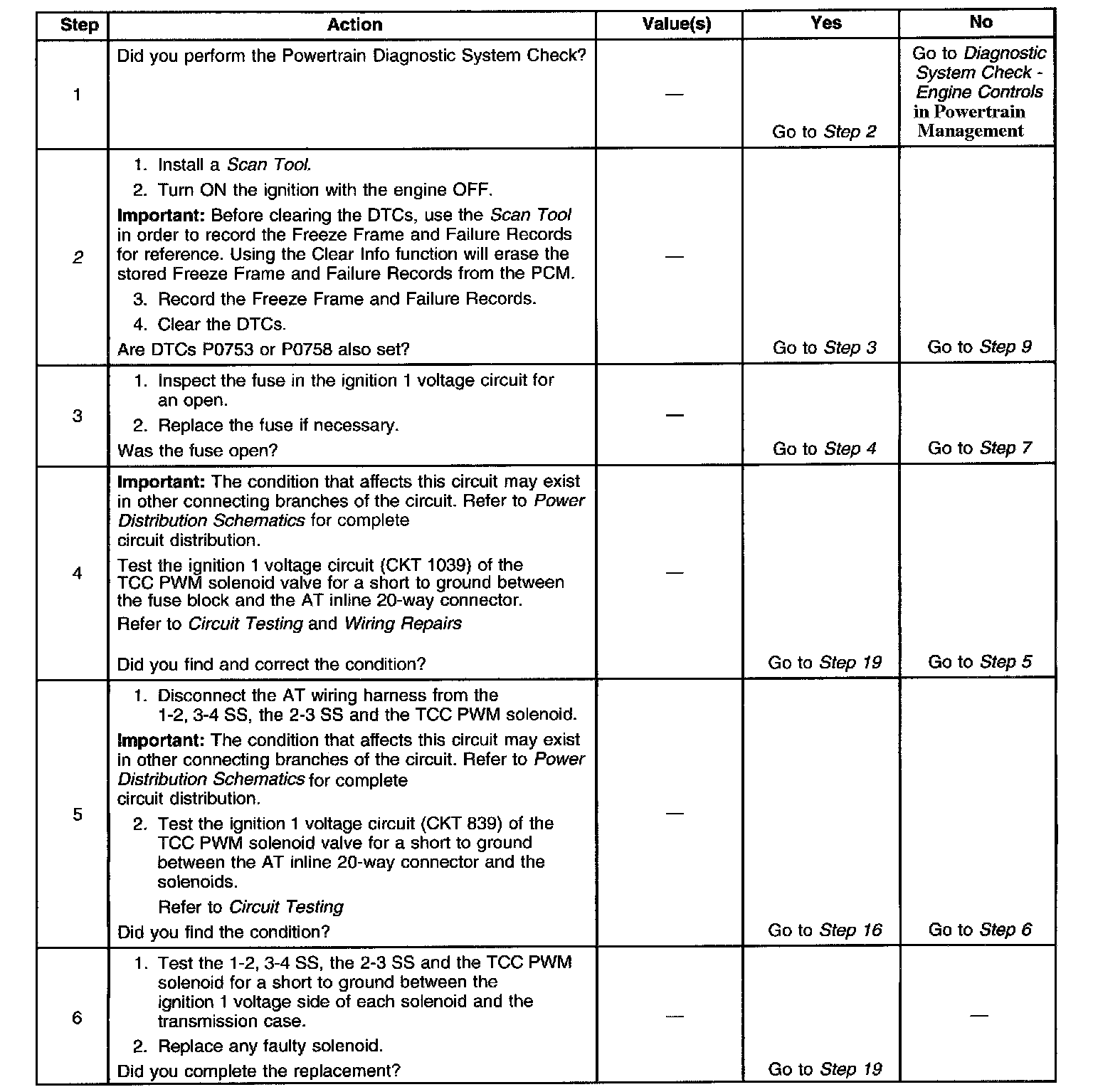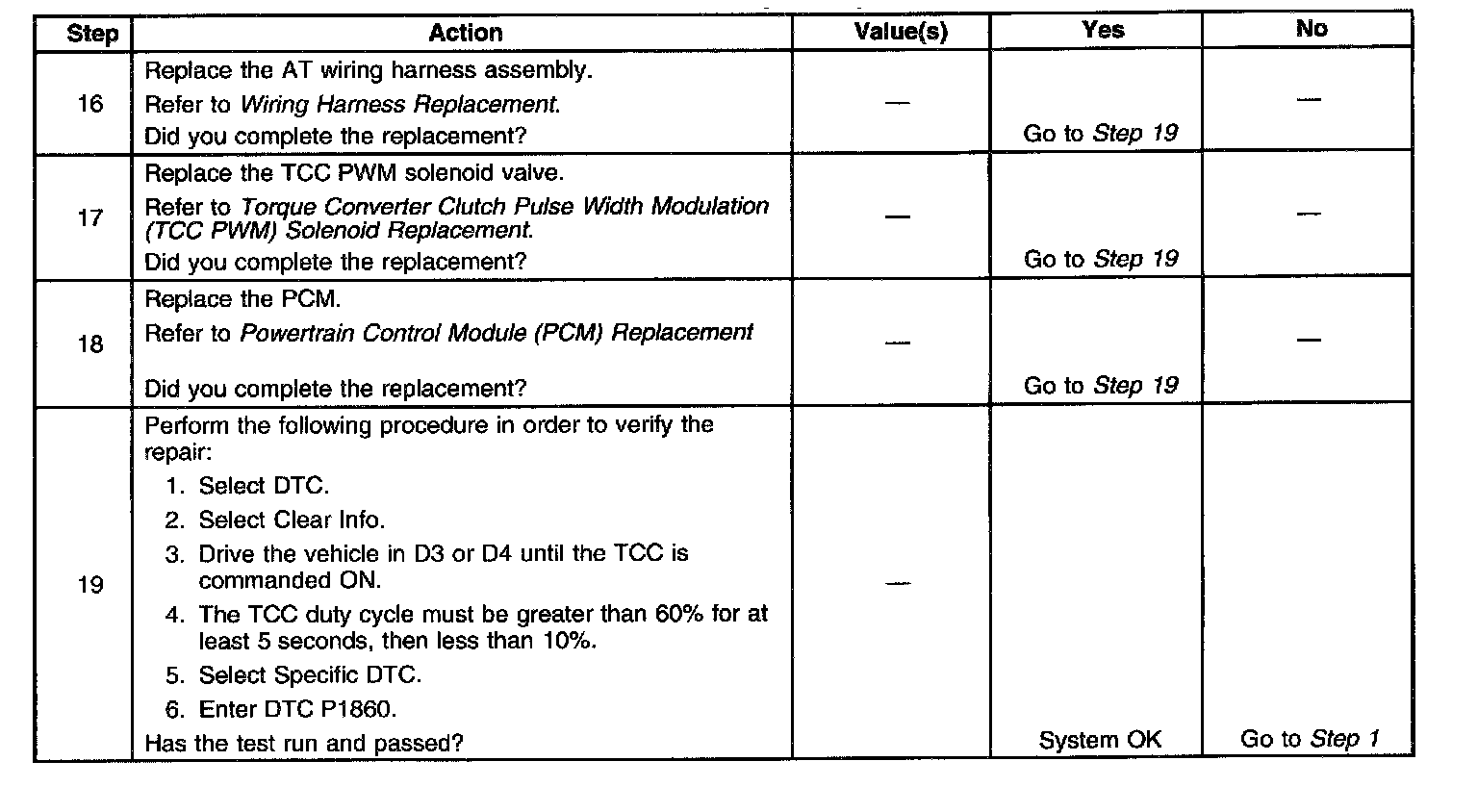 Ignition voltage is provided to the Torque Converter Clutch Pulse Width Modulation (TCC PWM) solenoid valve. The PCM controls the solenoid with a negative duty cycle in order to control application and release of the TCC. When the solenoid is commanded OFF, the PCM senses high voltage. When the solenoid is commanded ON, the PCM senses low voltage.
