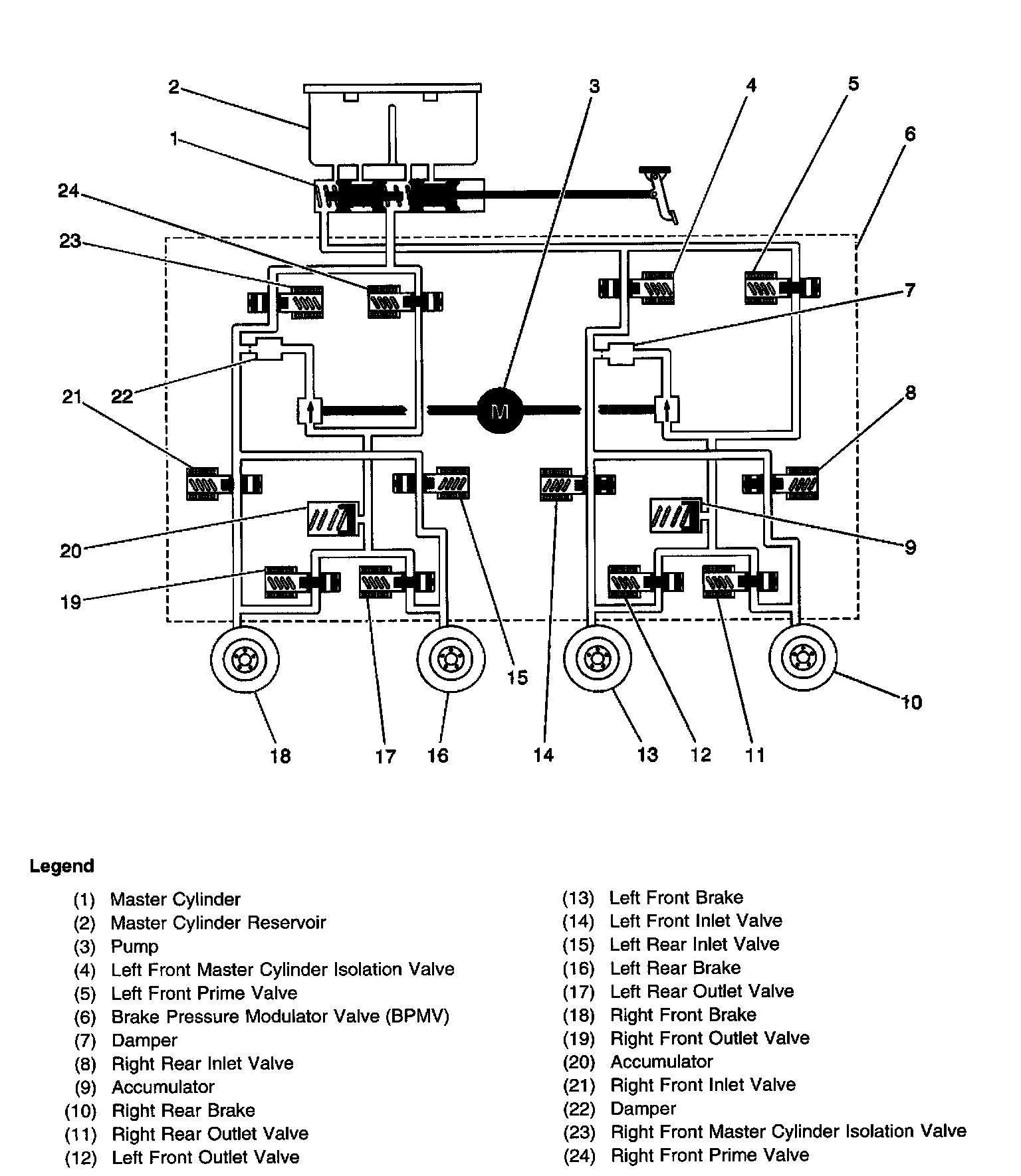 ^ Brake Pressure Modulator Valve (BPMV) - The BPMV contains the hydraulic valves and pump motor that are controlled electrically by the EBCM. The BPMV uses a 4 circuit configuration with a diagonal split. The BPMV directs fluid from the reservoir of the master cylinder to the left front and right rear wheels and fluid from the other reservoir to the right front and left rear wheels. The diagonal circuits are hydraulically isolated so that a leak or malfunction in one circuit will allow continued braking ability on the other.