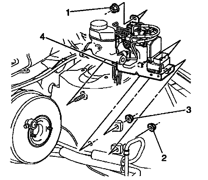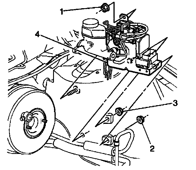 3. Remove the three BPMV bracket nuts (1,2,3) attaching the BPMV bracket (4) to the wheel housing.