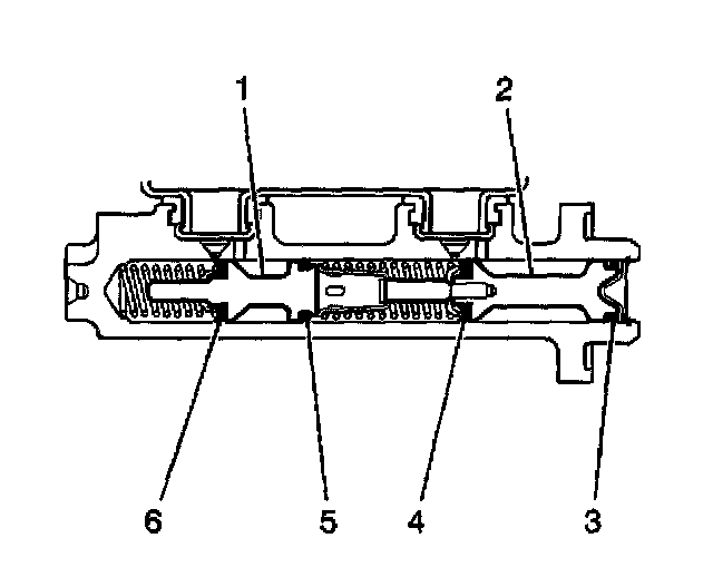 8. If the brake pedal apply did not feel spongy, and he brake pedal travel was initially steady and not excessive, but then gradually fell, then the master cylinder requires overhaul or replacement due to an internal leak past the secondary piston (1) from the secondary piston primary seal (6) or secondary seal (5).
