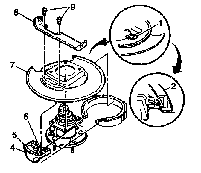 3. Position the park brake shoe, actuator (4), and backing plate (7) over the rear hub.