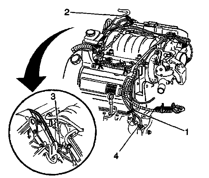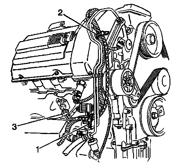 4. Remove the engine right coolant heater cord from behind the power steering pump (3).