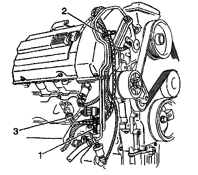 5. Install the engine right coolant heater cord behind the power steering pump (3).