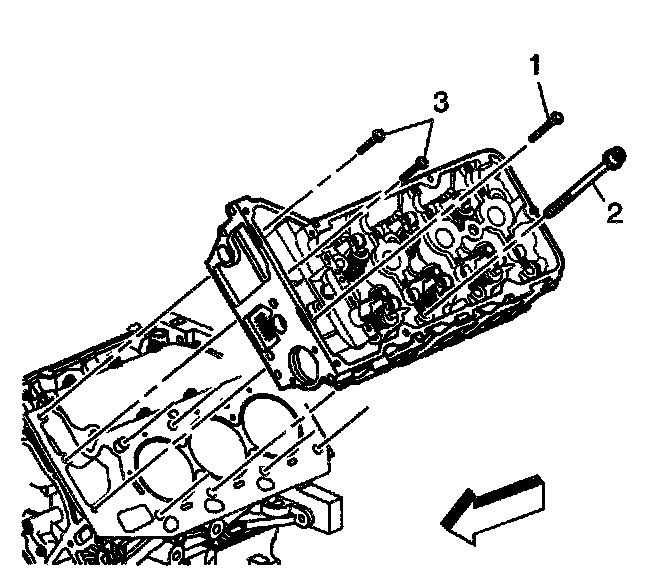 12. Remove the M6 external drive bolts (1 & 3) from the front portion of the cylinder head. Note the location of the longer M6 bolt (1).