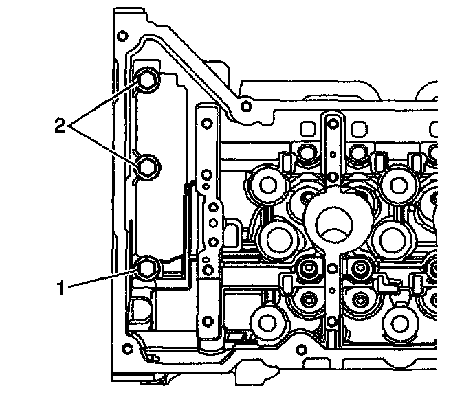 6. Install the M6 bolts at the front of the cylinder head. Install the longer M6 bolt (1) in the outboard location as shown. Install the two shorter M6 bolts (3) in the locations shown.