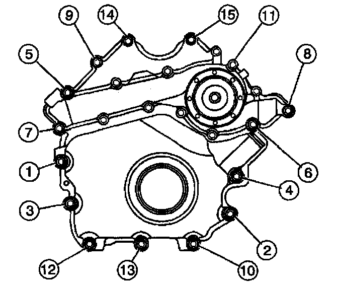 Tighten the front cover bolts in the sequence shown to 14 Nm (124 inch lbs.).