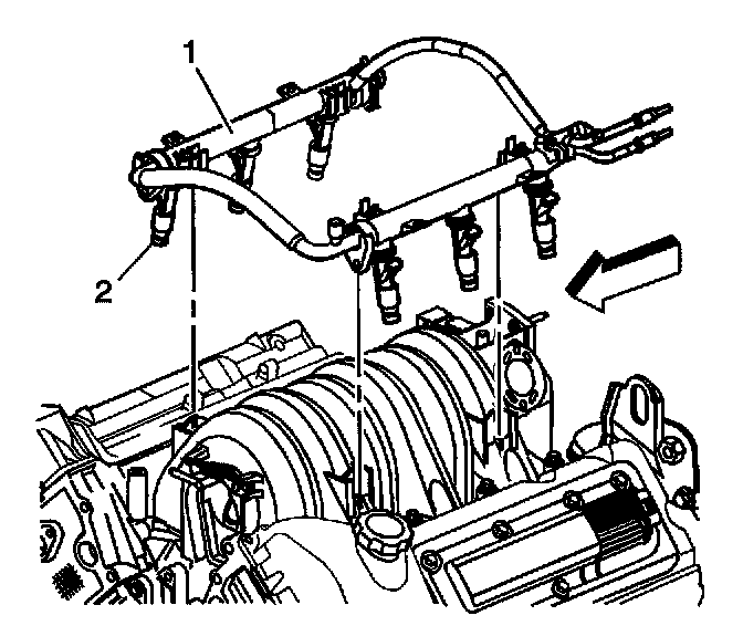 6. Install the fuel rail (1) and fuel injectors (2) by aligning the fuel injectors with their respective ports and pressing the four fuel rail snap-lock connectors into the intake manifold until they lock in place. DO NOT apply excessive pressure to the fuel rail in place. The need for excessive pressure may be caused by misalignment of a fuel injector and could cause damage to the seal or intake manifold.