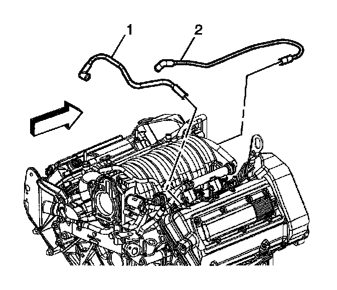 2. Connect the throttle body heater hose to the water crossover feed tube (1).