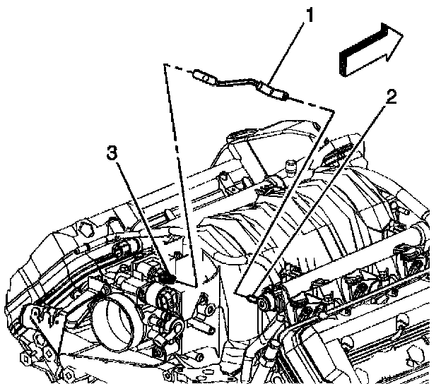 11. Connect the fuel pressure regulator vacuum tube (1) to the regulator (2) and the throttle body (3).