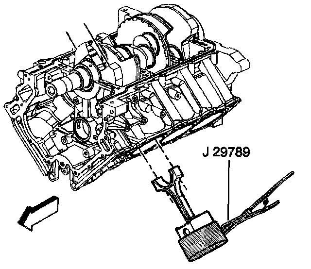 6. When the J 29789 contacts the deck surface, gently tap the piston into the cylinder using the handle end of a dead-blow hammer. Guide the connecting rod onto the crankshaft bearing journal while tapping the piston into the cylinder.