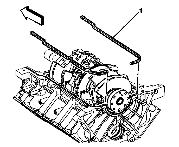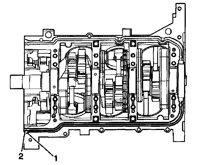 5. Apply a thin bead (2) of Gasket Maker, GM P/N 1052942, 6 ML or 1052943, 50 ML or equivalent, to the upper crankcase. From the front of the block apply a bead 1 - 2 mm thick (0.040 - 0.080 inch) inline with the silicone seal (1) and through the centerline of the bolt holes but not through the bolt holes. Continue applying the bead until the end of the crankcase at the back of the block. Do not apply the bead all the way to the crankshaft rear oil seal.