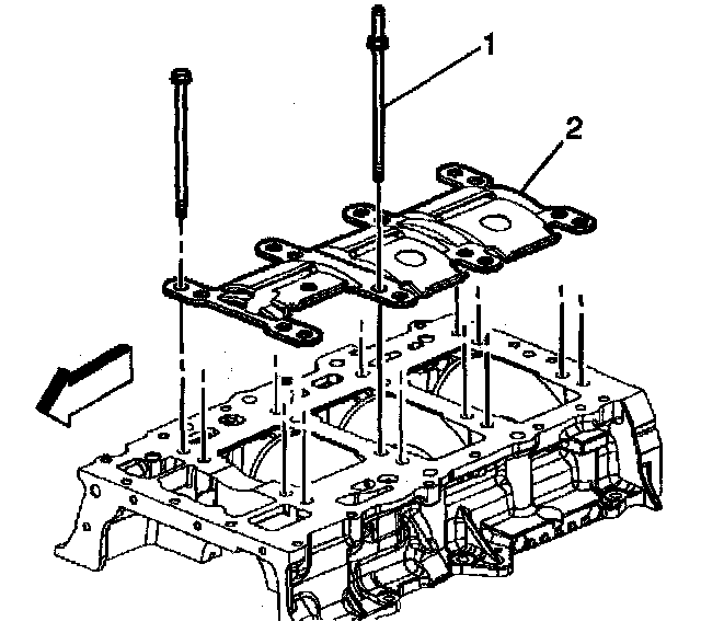 7. Place into position the main bearing bolts. The single stud-head bolt (1) is used for oil pump pick-up mounting.