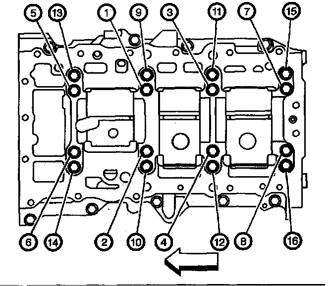 12. Tighten the lower crankcase bolts (1 through 16) in proper sequence.