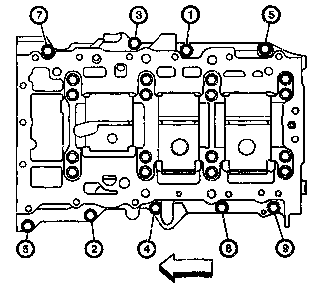 13. Tighten the lower crankcase perimeter bolts (1 through 9) in proper sequence.
