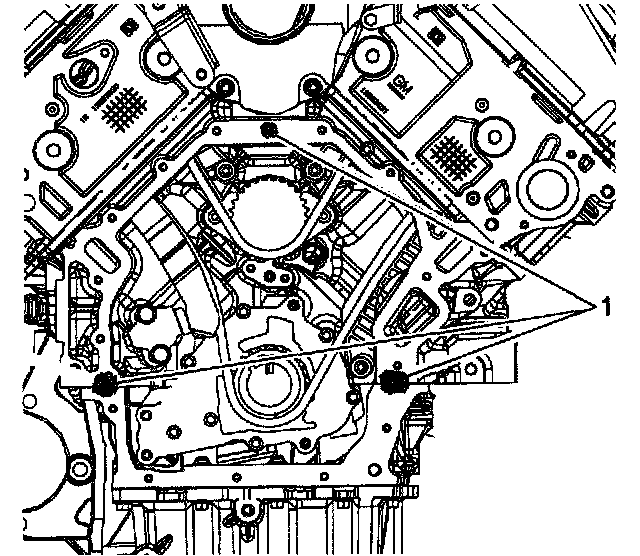 1. Place a short bead of RTV sealant, GM P/N 12345739 or equivalent, on the cylinder block in the locations shown (1).
