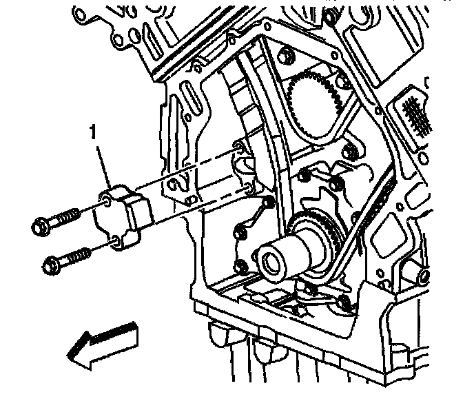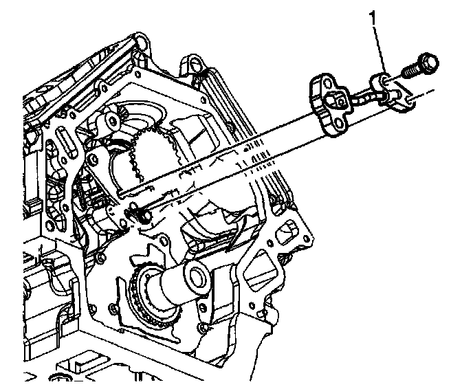 17. Install the primary camshaft drive chain tensioner (1) and primary camshaft drive chain tensioner bolts.