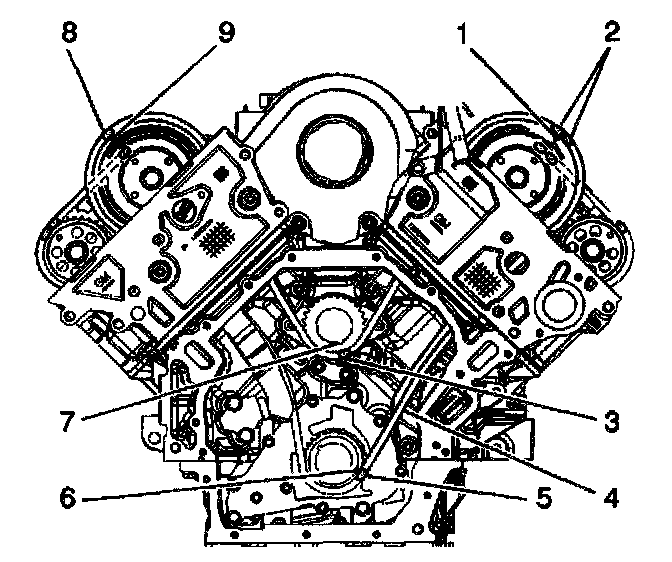 10. Wrap the primary camshaft drive chain around the right intake camshaft sprocket and align the darkened link (8) with the sprocket's timing mark (9).