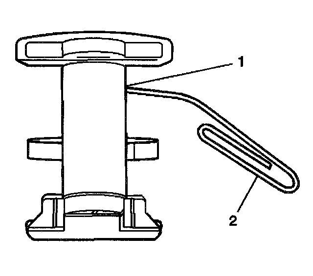 3. Lock the left secondary timing chain tensioner by inserting a piece of wire (2) into the access hole in the side of the left secondary timing chain tensioner (1).