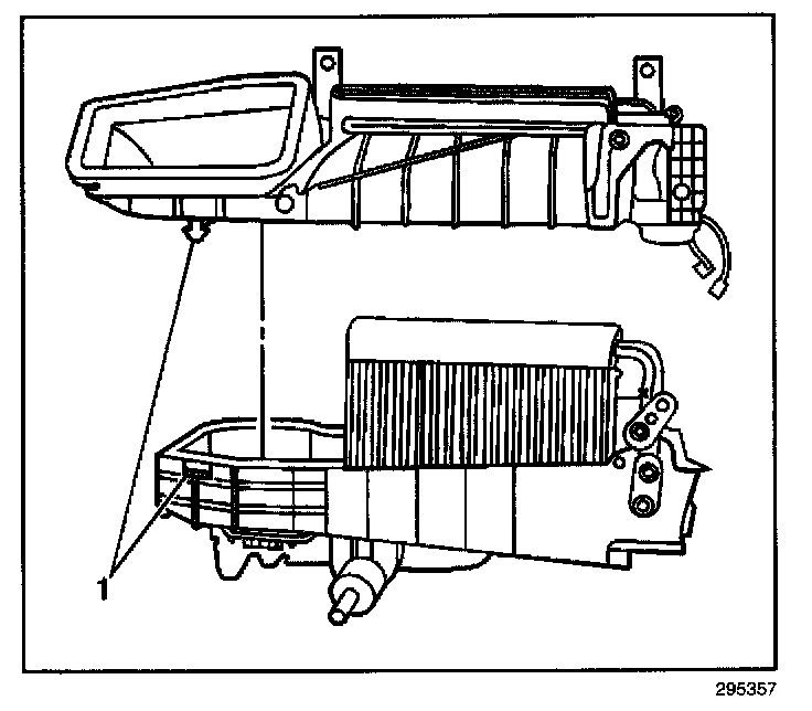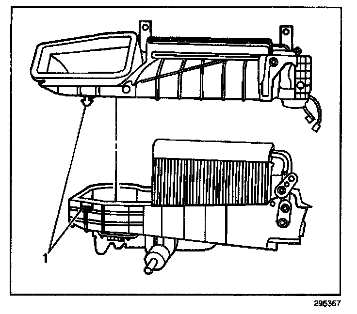 6. Release the retaining tab (1) securing the HVAC module halves.