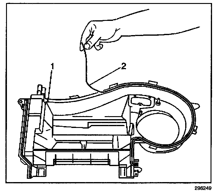 8. Remove the HVAC module seal that is located between the upper and lower cases (2).