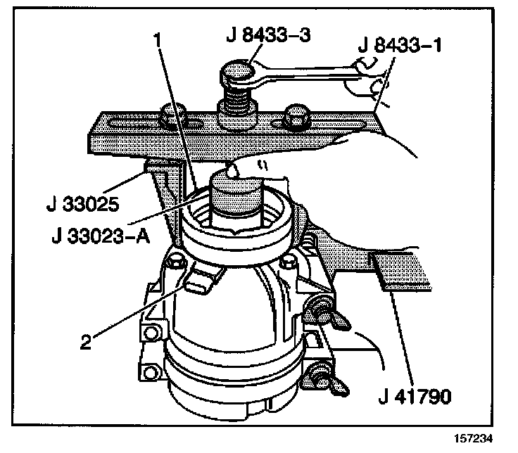 9. Tighten the center forcing screw J 8433-3 of the J 8433 against the J 33023-A to remove the A/C compressor clutch coil from the A/C compressor.